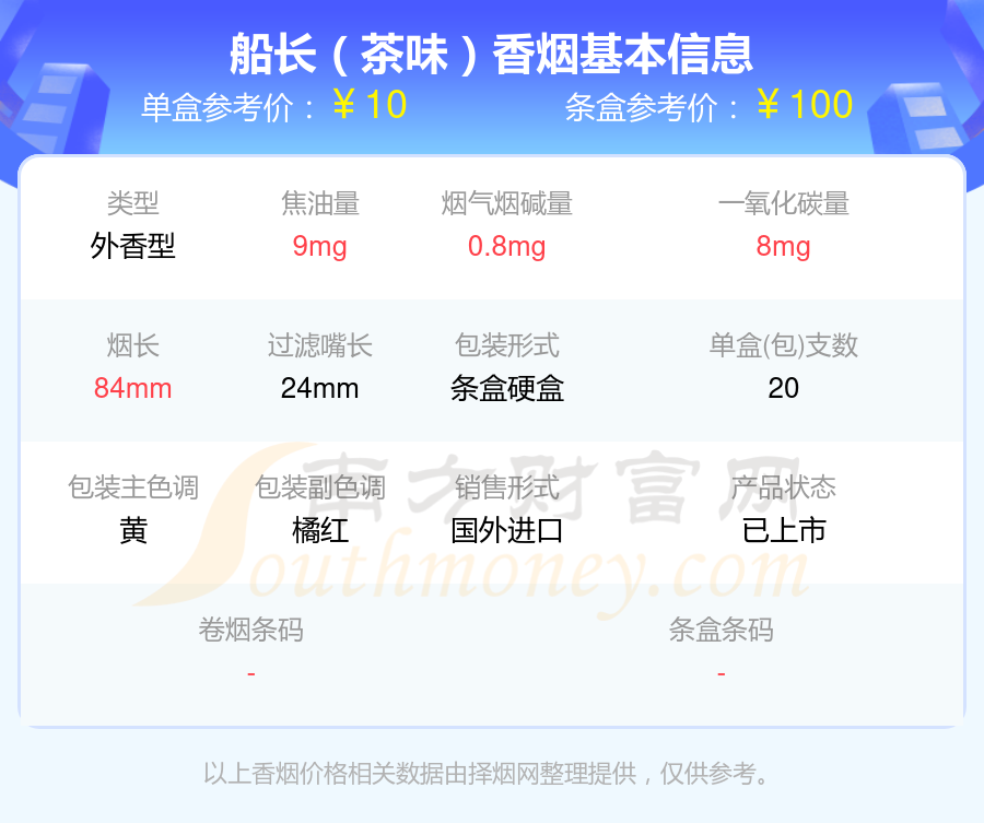 ARK ROYAL(船长)香烟烟碱量10mg以下的烟分别有船长(茶味)参考价10元/包、船长(特级)参考价10元/包等。