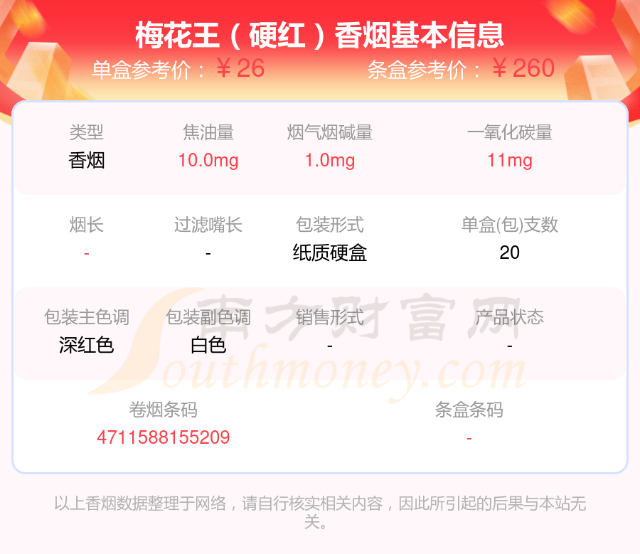 梅花王(硬红)参考价26.0元/包、梅花王(硬蓝)参考价25.0元/包、梅花王(旗袍红硬包烟)参考价35.0元/包等。