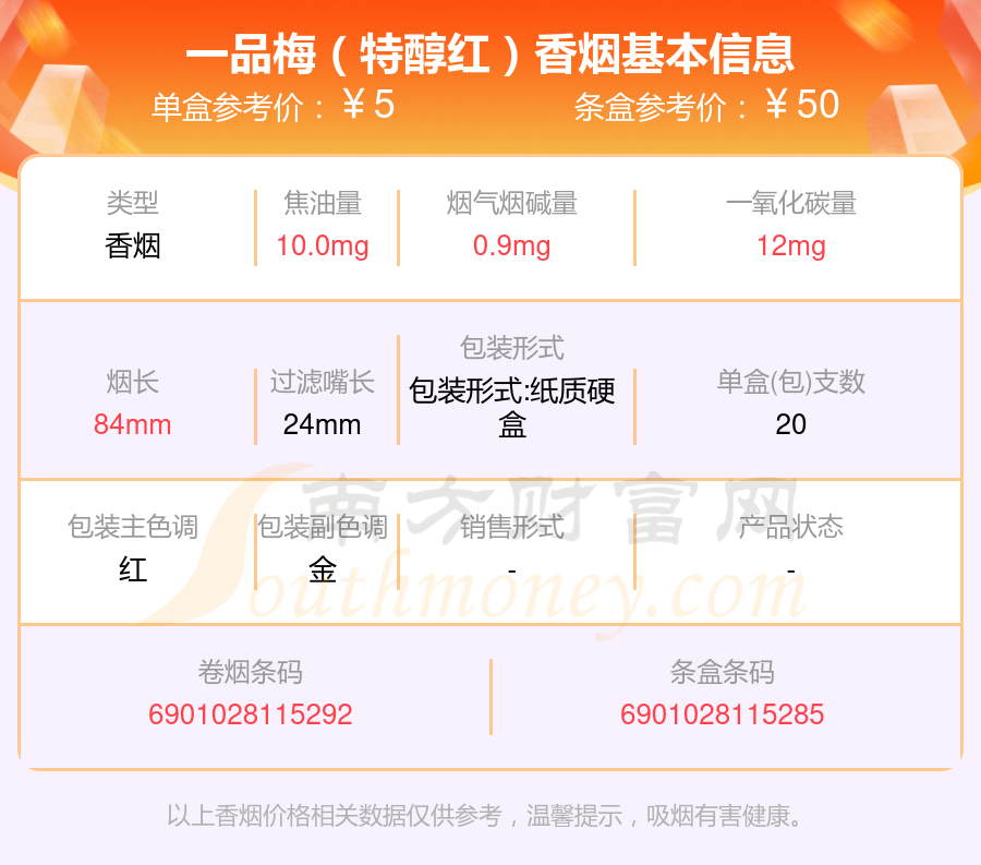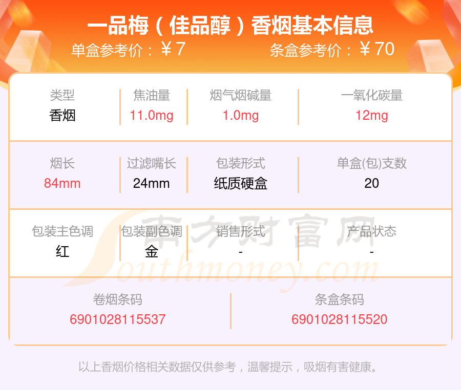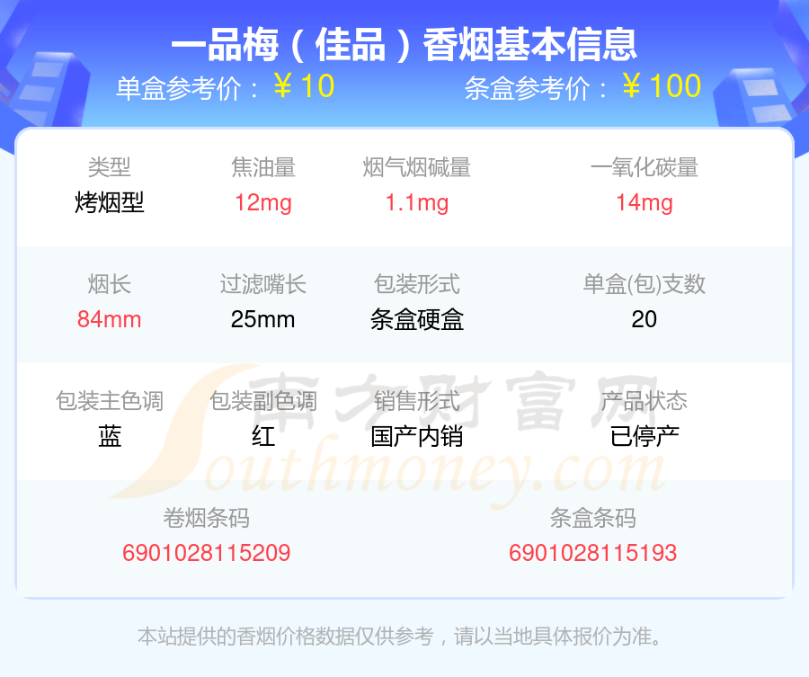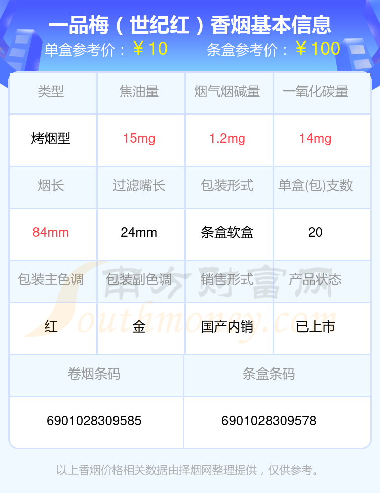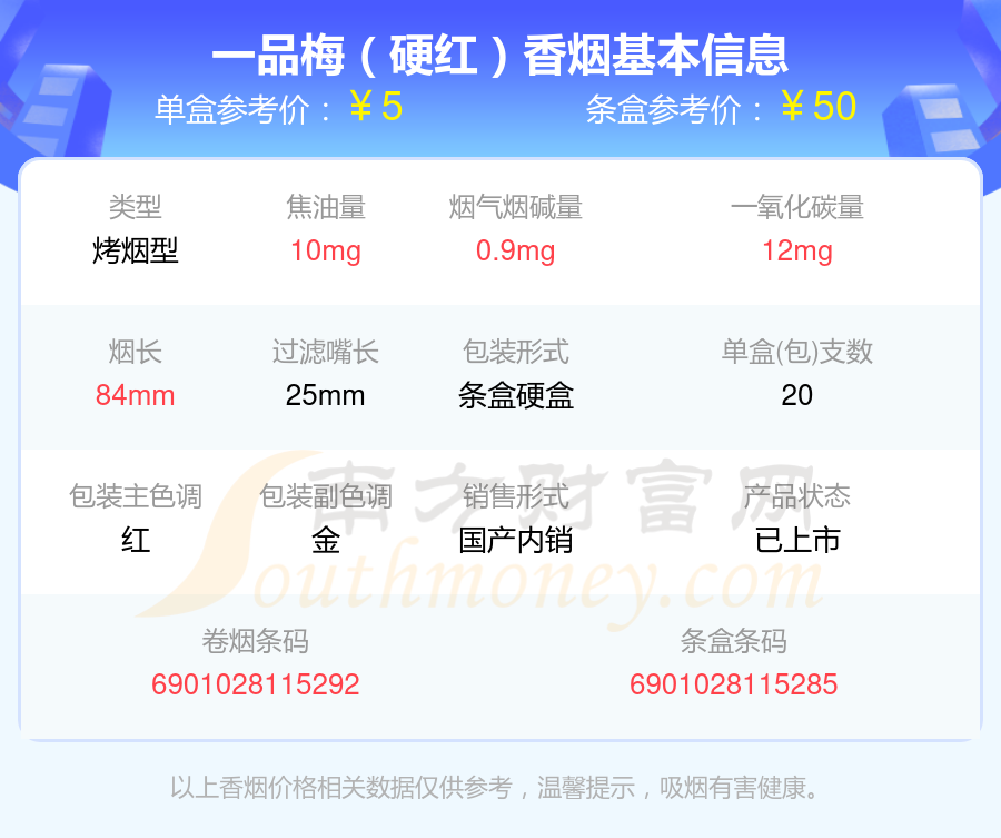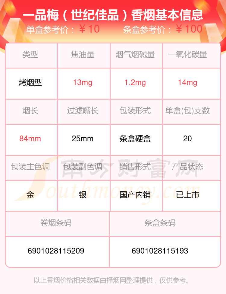 择烟网为大家盘点了一品梅香烟十元以下的,分别有一品梅(佳品醇)、一品梅(特醇红)、一品梅(硬红)、一品梅(淡黄)、一品梅(佳品蓝)、一品梅(世纪红)、一品梅(世纪佳品)、一品梅(佳品)等,详细价格如下: