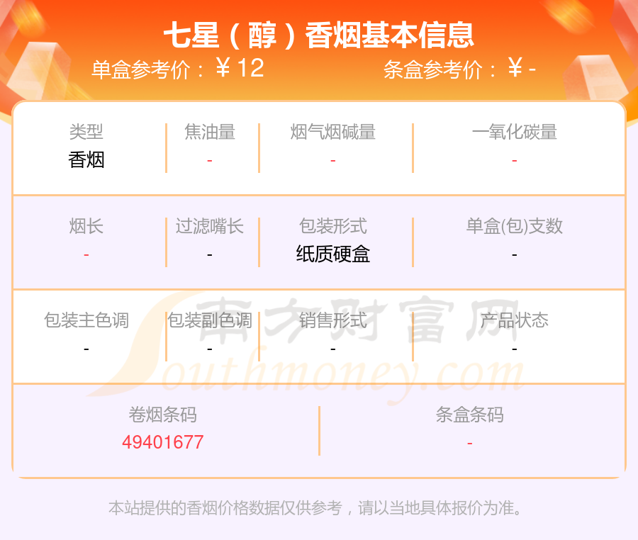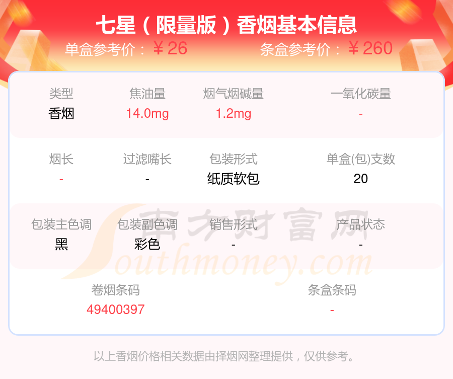 七星(薄荷12mg)参考价30.0元/包、七星(灰出口)参考价28.0元/包、七星(限量版)参考价26.0元/包、七星(软黑)7mg参考价25.0元/包、七星(台湾黄标)参考价22.0元/包、七星(硬灰)欧盟免税版参考价15.0元/包、七星(灰)中免参考价12.0元/包、七星(醇)参考价12.0元/包等。