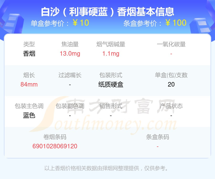 白沙(利事硬蓝)单盒参考价:10元