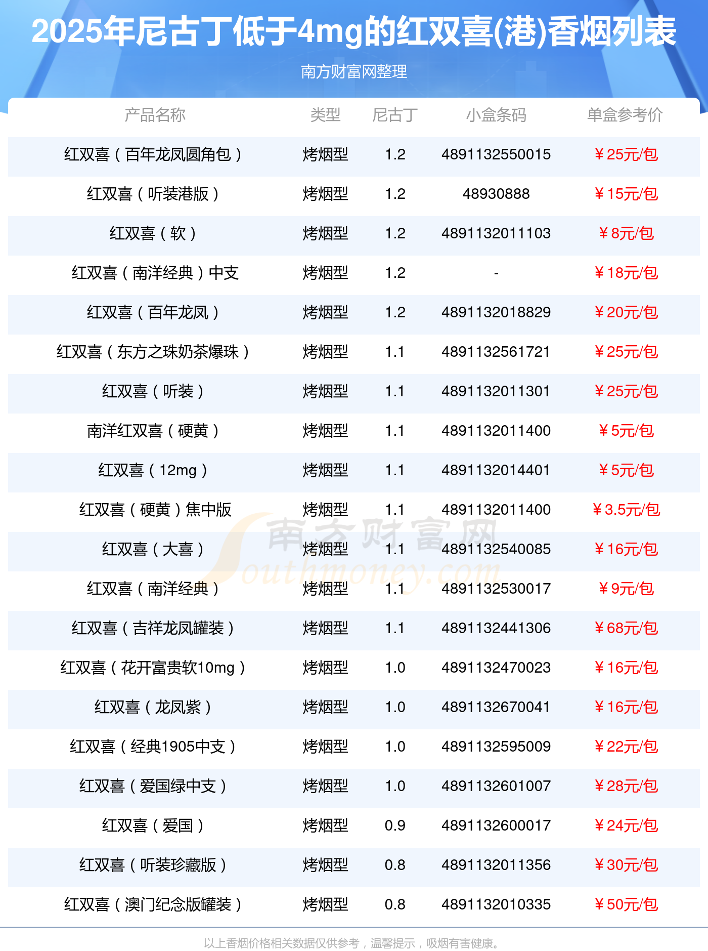 红双喜(港)香烟尼古丁低于4mg的烟有红双喜(百年龙凤圆角包)、红双喜(听装港版)、红双喜(软)、红双喜(南洋经典)中支、红双喜(百年龙凤)、红双喜(东方之珠奶茶爆珠)、红双喜(听装)、南洋红双喜(硬黄)、红双喜(12mg)、红双喜(硬黄)焦中版等,详细价格如下: