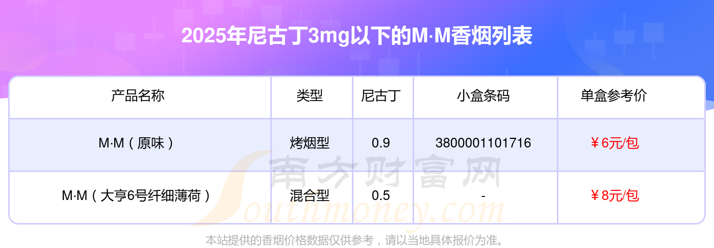 M·M香烟尼古丁3mg以下的烟有M·M(原味)、M·M(大亨6号纤细薄荷)等,具体价格如下: