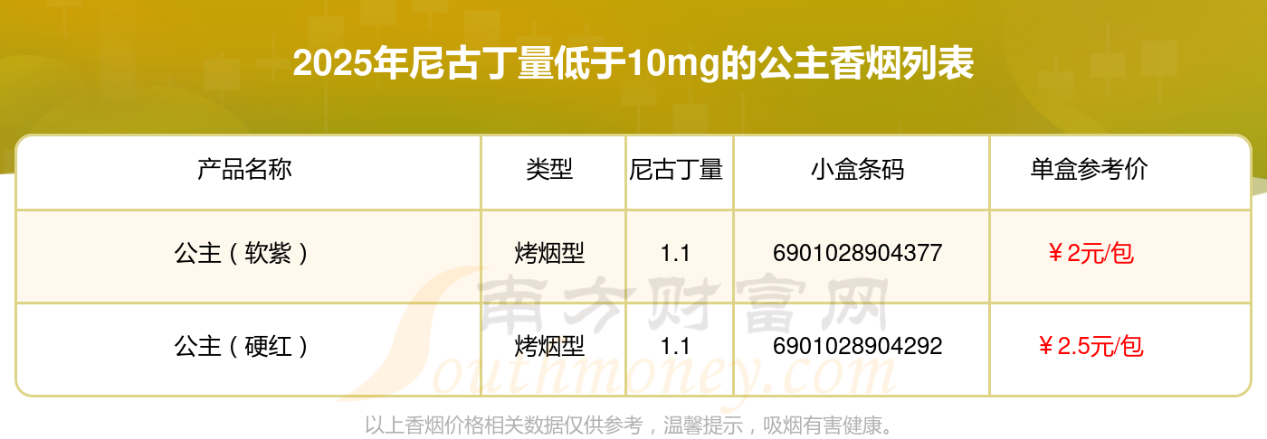 择烟网为大家盘点了公主香烟尼古丁量低于10mg的烟,有以下这些: