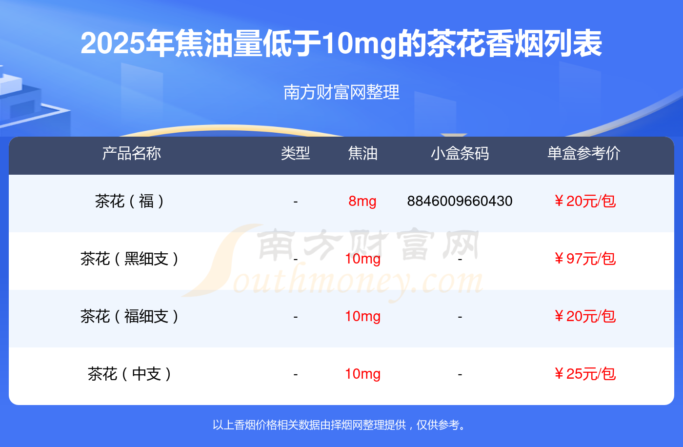 茶花香烟焦油量低于10mg的烟都有哪些(2025年)
