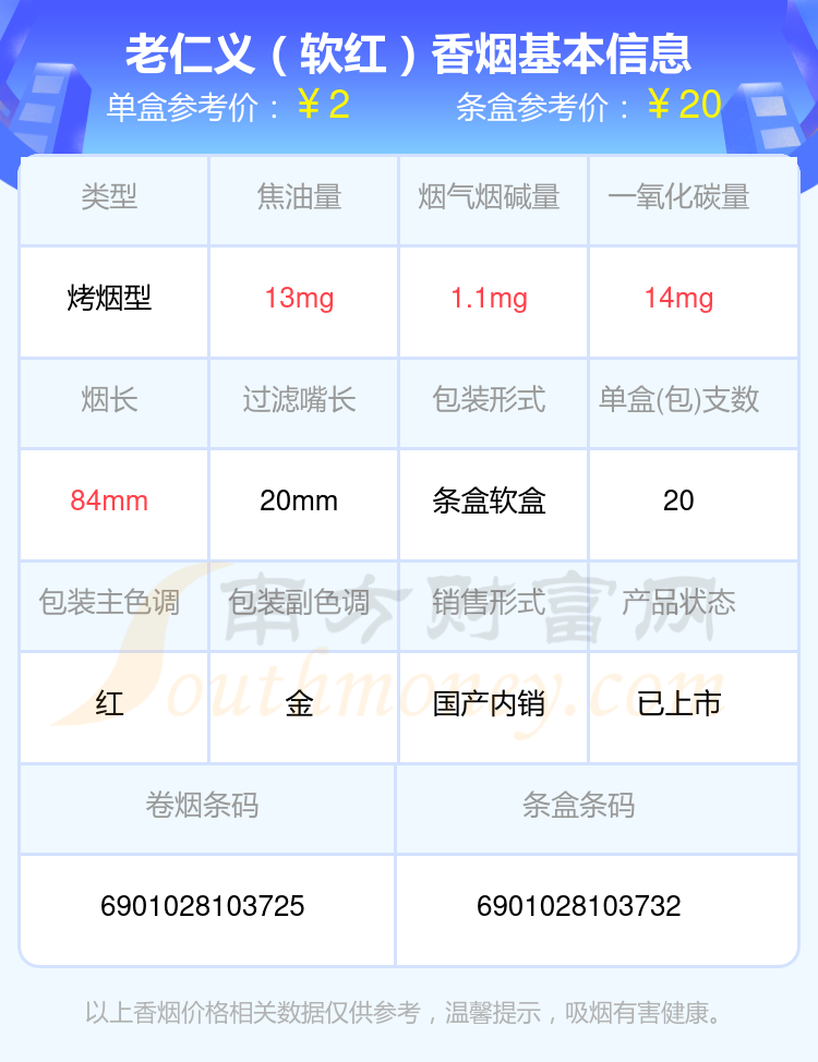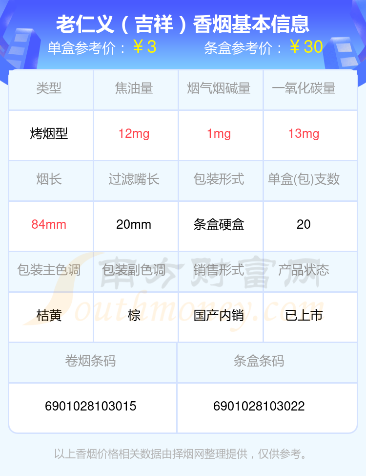 老仁义(和谐)参考价2.5元/包、老仁义(软红)参考价2元/包、老仁义(吉祥)参考价3元/包等。