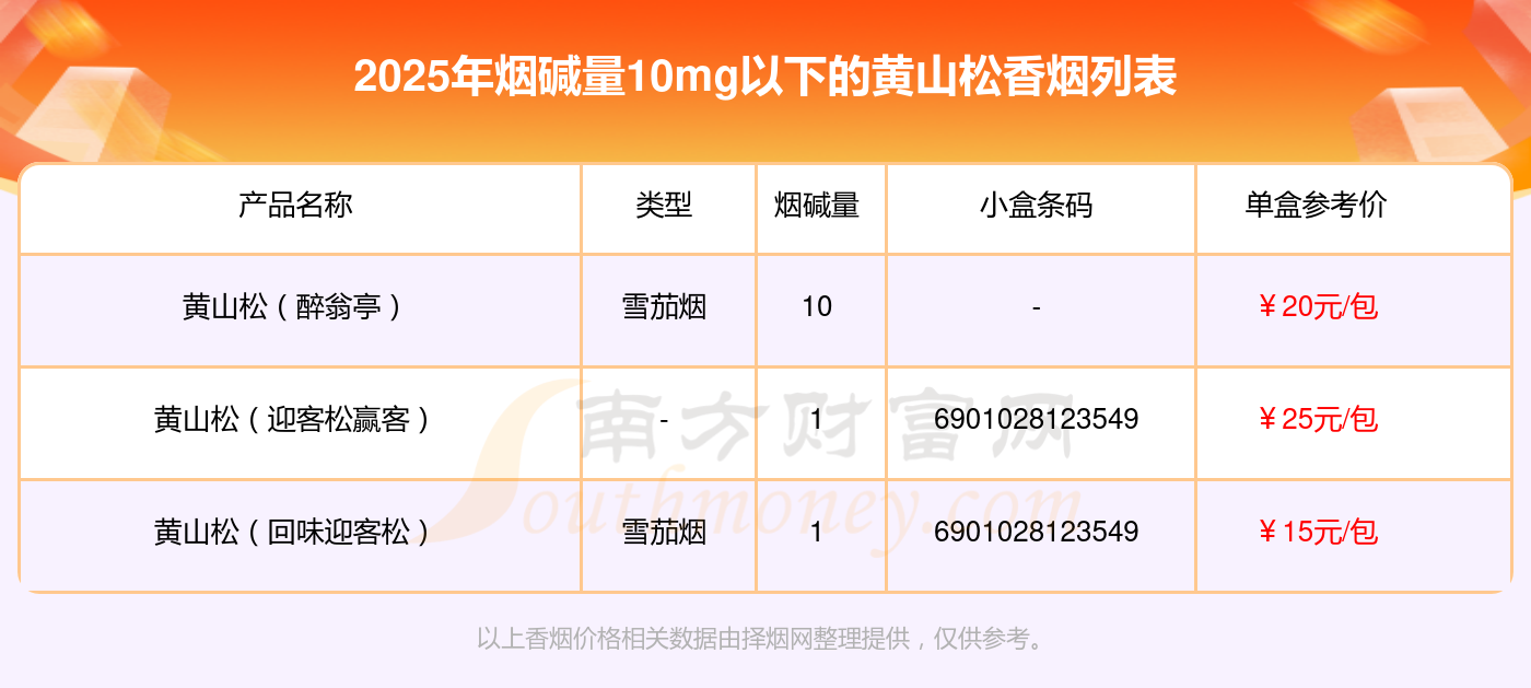 择烟网为大家盘点了黄山松香烟烟碱量10mg以下的,分别有黄山松(醉翁亭)、黄山松(迎客松赢客)、黄山松(回味迎客松)等,详细价格如下: