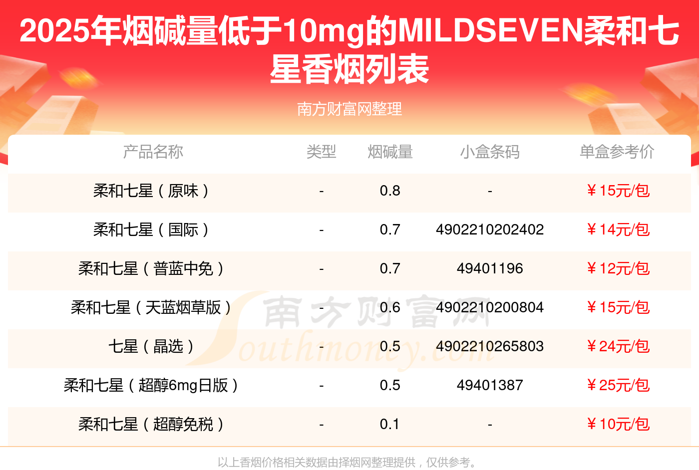 柔和七星(原味)参考价15元/包、柔和七星(国际)参考价14元/包、柔和七星(普蓝中免)参考价12元/包、柔和七星(天蓝烟草版)参考价15元/包、七星(晶选)参考价24元/包、柔和七星(超醇6mg日版)参考价25元/包、柔和七星(超醇免税)参考价10元/包等。