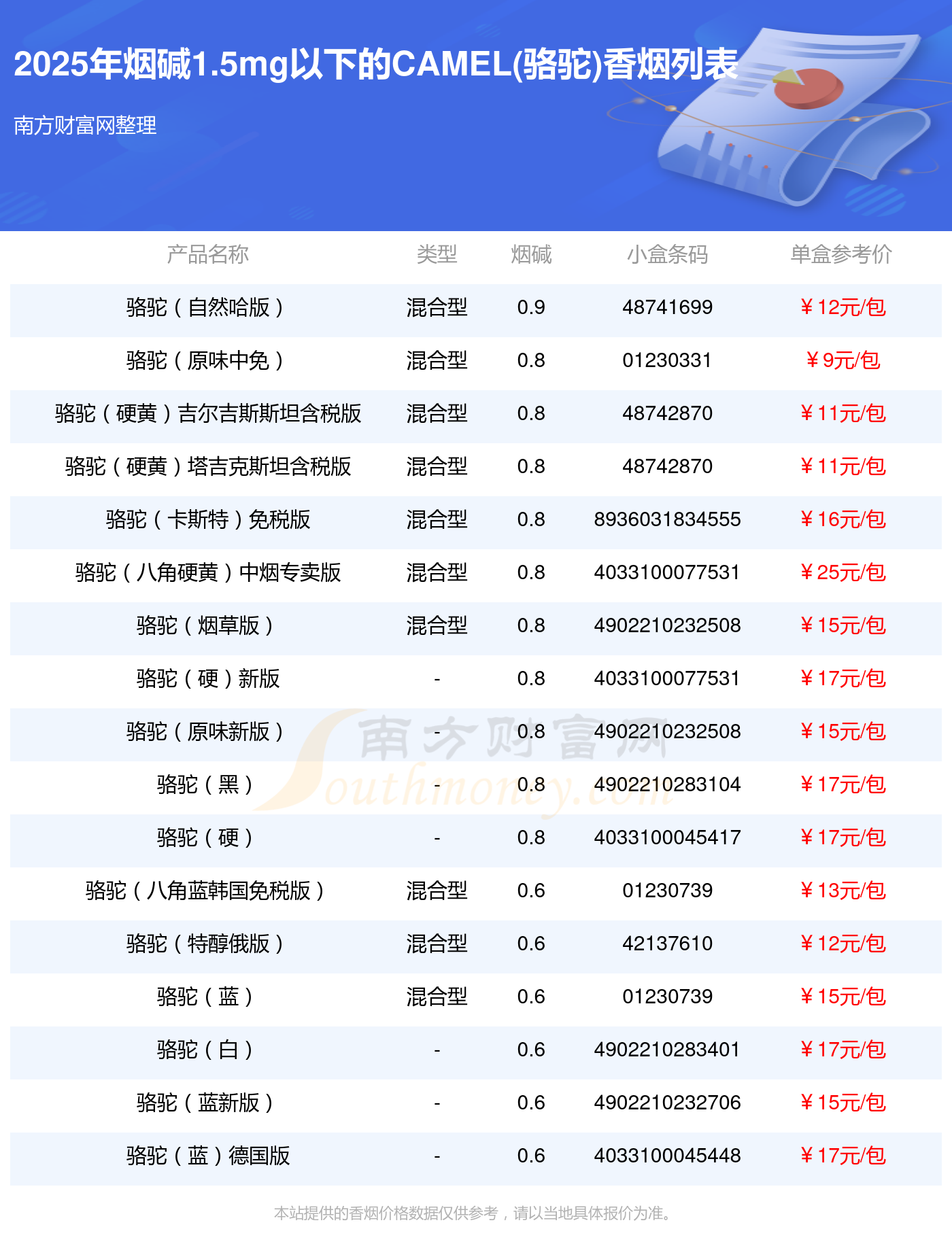 骆驼(自然哈版)参考价12.0元/包、骆驼(原味中免)参考价9.0元/包、骆驼(硬黄)吉尔吉斯斯坦含税版参考价11.0元/包、骆驼(硬黄)塔吉克斯坦含税版参考价11.0元/包、骆驼(卡斯特)免税版参考价16.0元/包、骆驼(八角硬黄)中烟专卖版参考价25.0元/包、骆驼(烟草版)参考价15.0元/包、骆驼(硬)新版参考价17元/包、骆驼(原味新版)参考价15元/包、骆驼(黑)参考价17元/包等。