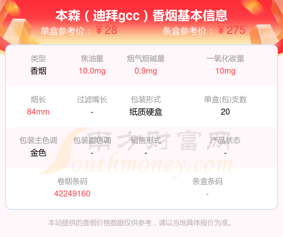 本森(南非版)参考价24.0元/包、本森(迪拜gcc)参考价28.0元/包等。