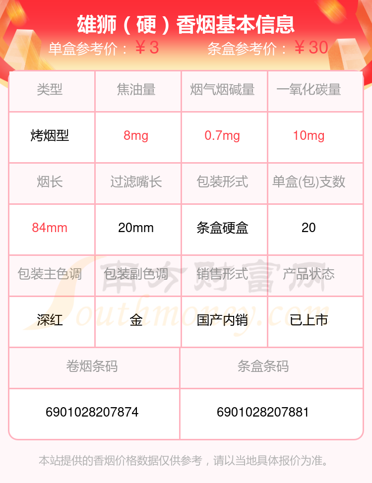雄狮香烟焦油量低于8mg的烟有雄狮(红)、雄狮(红老版)、雄狮(双叶.薄荷)、雄狮(硬)、雄狮(薄荷)等,具体价格如下: