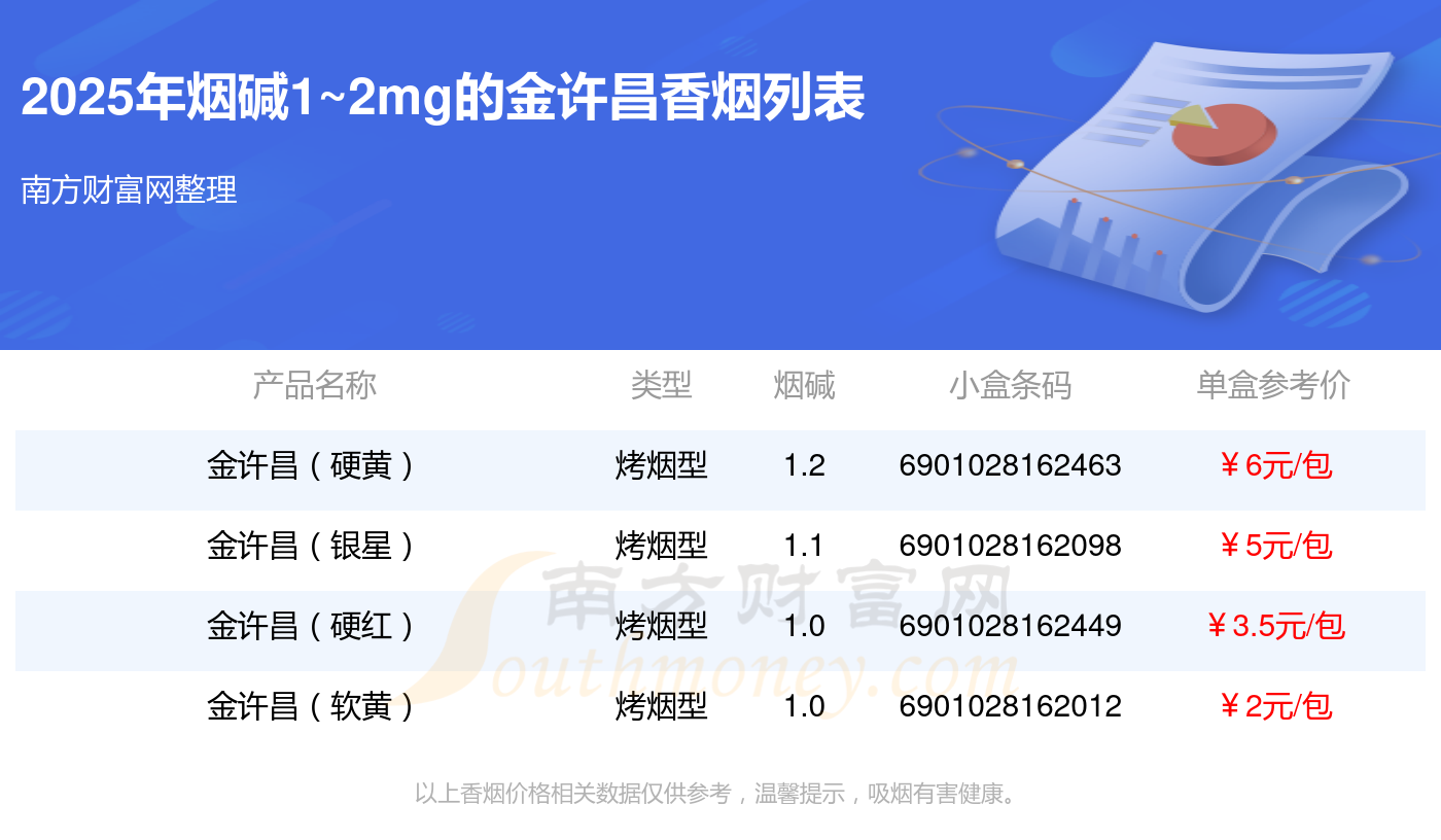 金许昌(硬黄)参考价6.0元/包、金许昌(银星)参考价5.0元/包、金许昌(硬红)参考价3.5元/包、金许昌(软黄)参考价2.0元/包等。