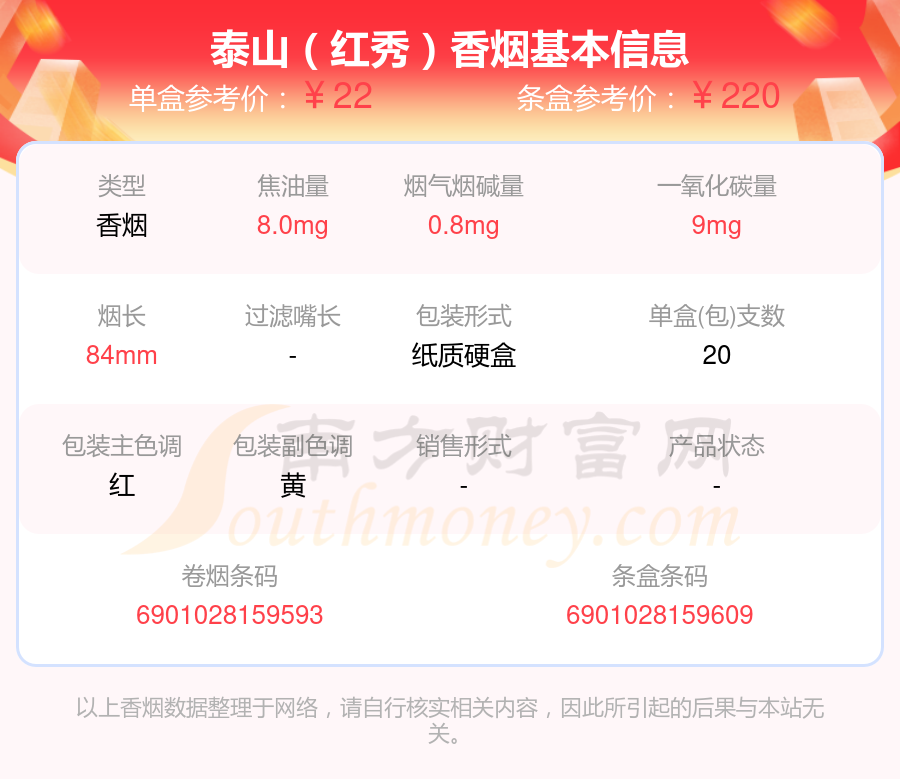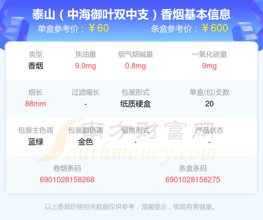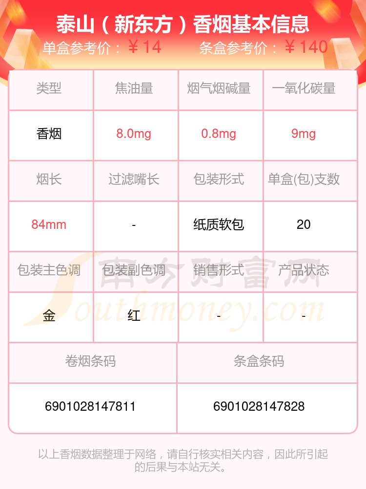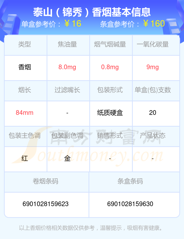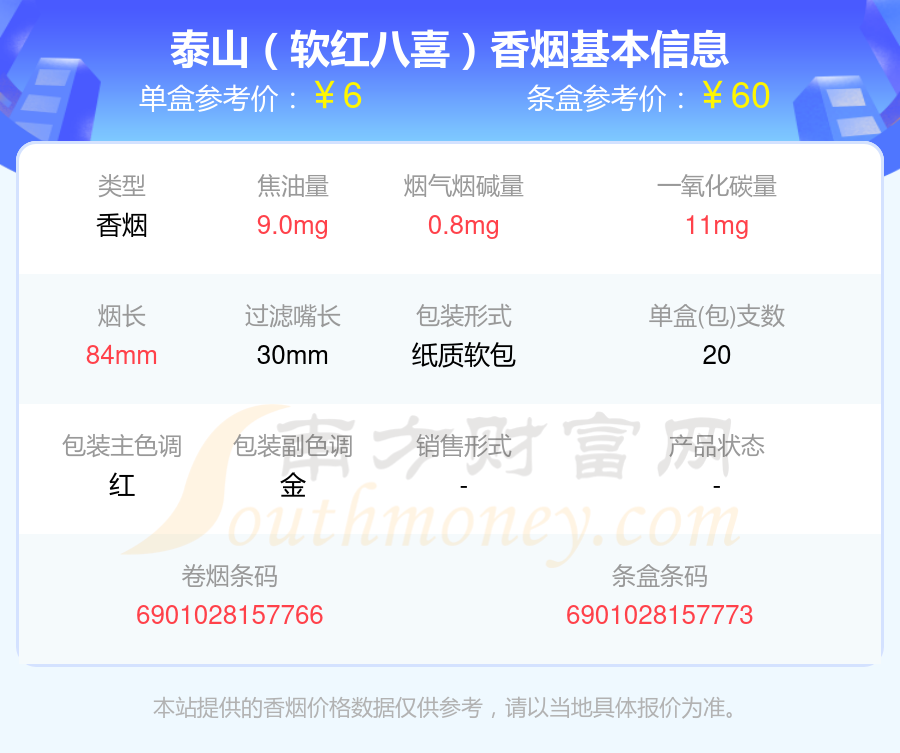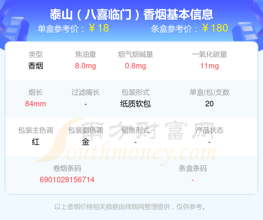 择烟网为大家盘点了泰山香烟焦油量8mg-15mg的,分别有泰山(软红八喜)、泰山(中海御叶双中支)、泰山(八喜)、泰山(八喜临门)、泰山(望岳)、泰山(锦秀)、泰山(天秀)、泰山(红秀)、泰山(新东方)、泰山(祥秀)等,具体价格如下: