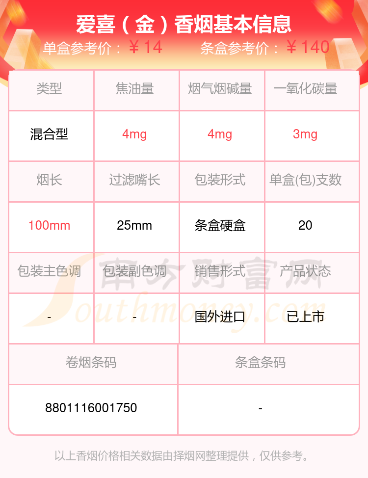 ESSE(爱喜)香烟尼古丁超过3mg的烟有爱喜(薄荷细支)、爱喜(金)等,详细价格如下: