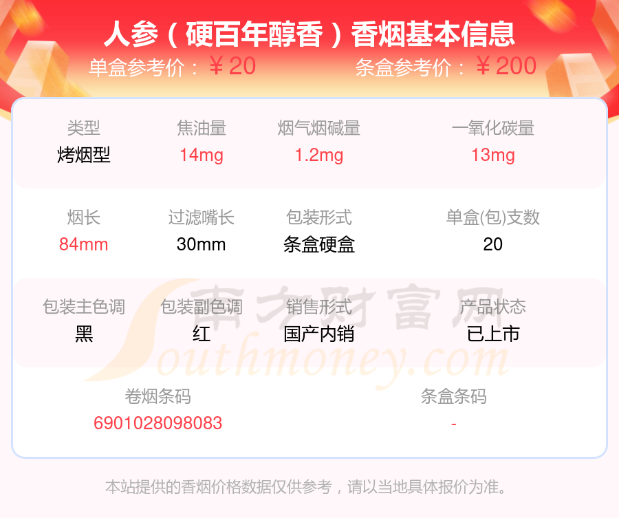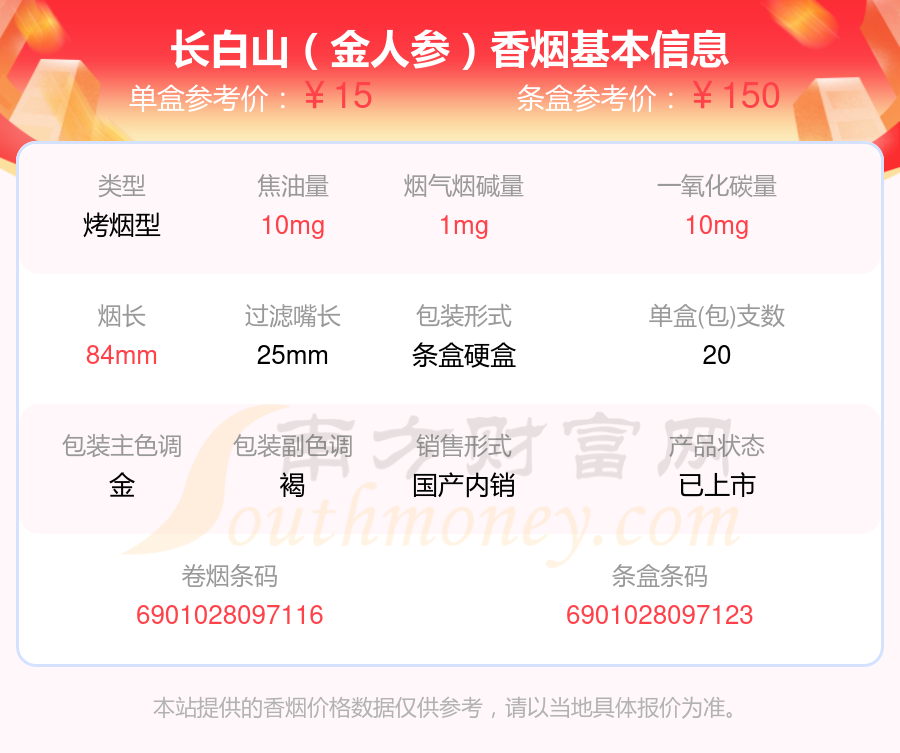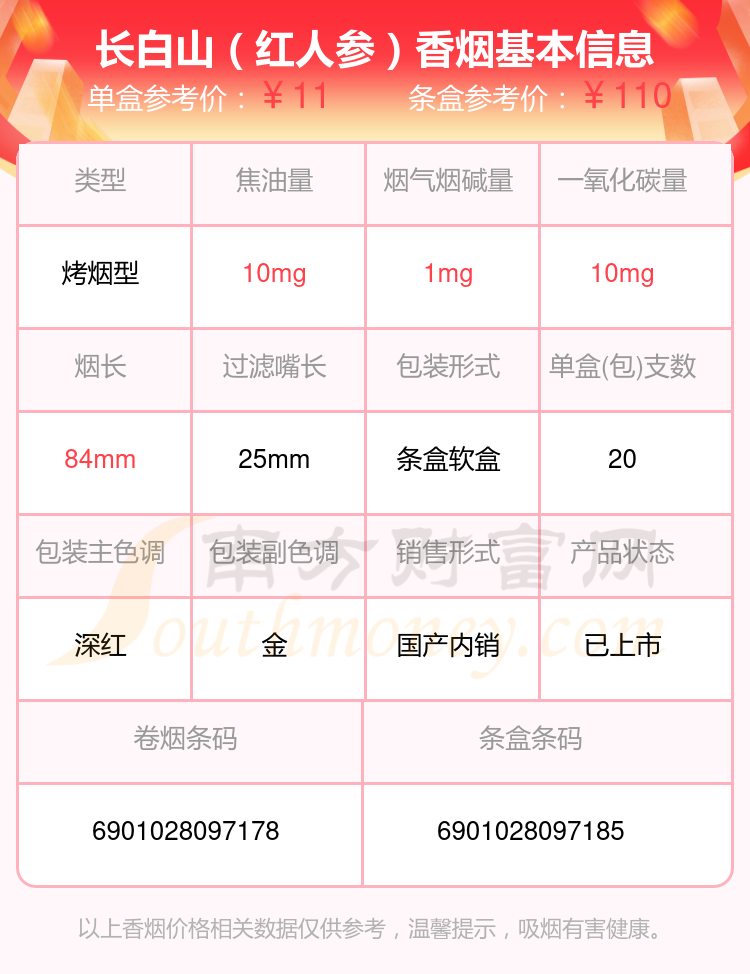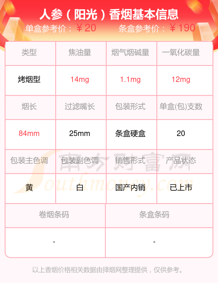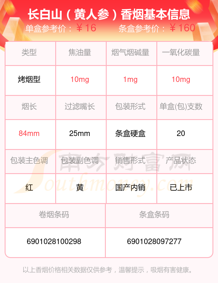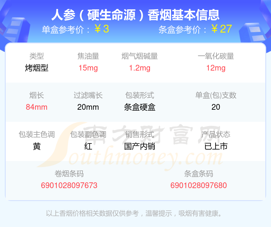 择烟网为大家盘点了人参香烟尼古丁量低于4mg的,分别有人参(硬生命源)、人参(硬百年醇香)、人参(百年)、人参(阳光)、人参(VIP)、人参(软红生命源)、长白山(黄人参)、长白山(红人参)、长白山(金人参)、人参(硬佳品生命源)等,详细价格如下:
