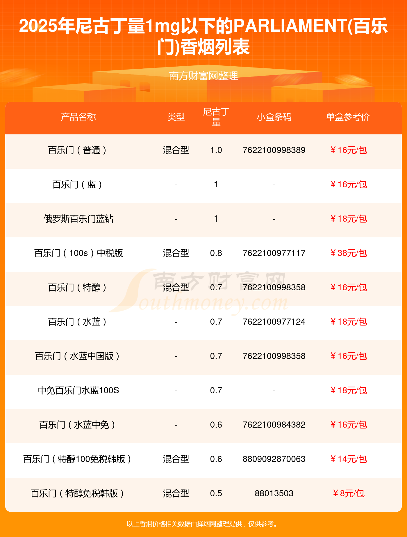 择烟网为大家盘点了PARLIAMENT(百乐门)香烟尼古丁量1mg以下的烟,有以下这些: