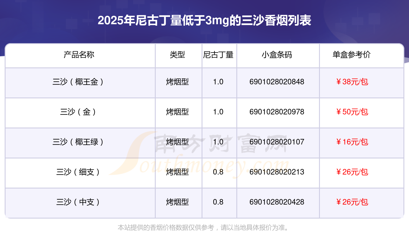 择烟网为大家盘点了三沙香烟尼古丁量低于3mg的烟,有以下这些: