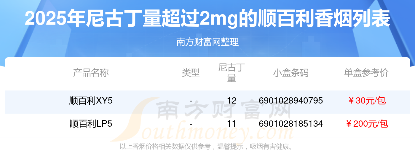 尼古丁量超过2mg的顺百利香烟有哪些?择烟网为大家整理盘点,分别有: