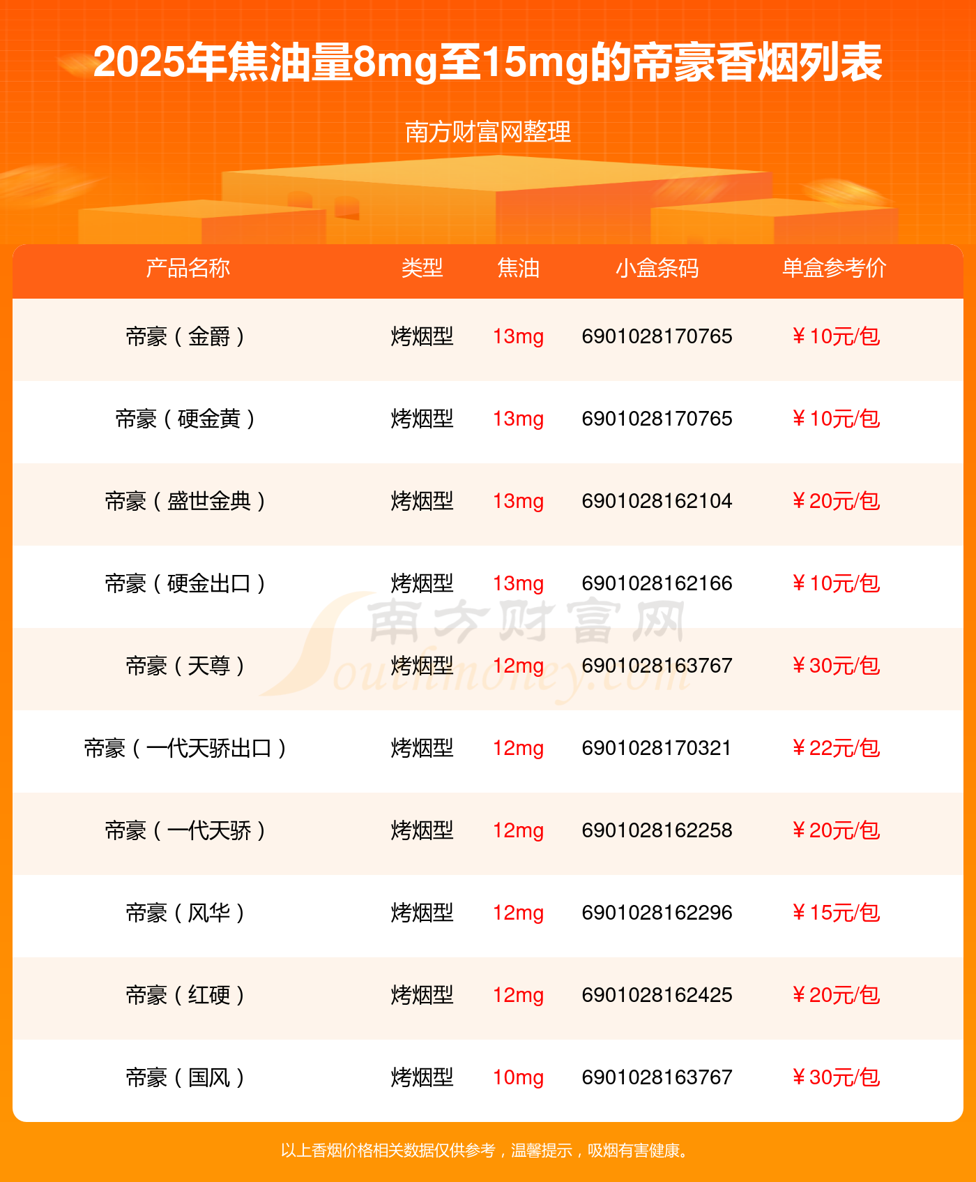 帝豪香烟焦油量8mg至15mg的烟有帝豪(金爵)、帝豪(硬金黄)、帝豪(盛世金典)、帝豪(硬金出口)、帝豪(天尊)、帝豪(一代天骄出口)、帝豪(一代天骄)、帝豪(风华)、帝豪(红硬)、帝豪(国风)等,详细价格如下: