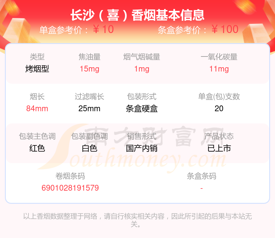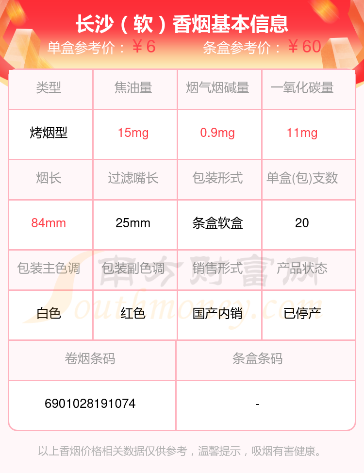 长沙香烟烟碱量低于2mg的烟有长沙(喜)、长沙(软)等,详细价格如下: