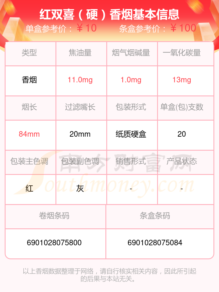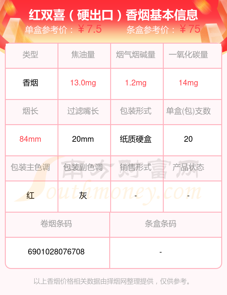 择烟网为大家盘点了尼古丁低于2mg的红双喜(沪)香烟,有红双喜(软)、红双喜(硬出口)、红双喜(硬16mg出口)、红双喜(硬晶喜)、红双喜(晶派)、红双喜(硬金上海)、红双喜(硬)、红双喜(硬精品)、红双喜(硬百顺)、红双喜(珍品江山)等,详细价格如下: