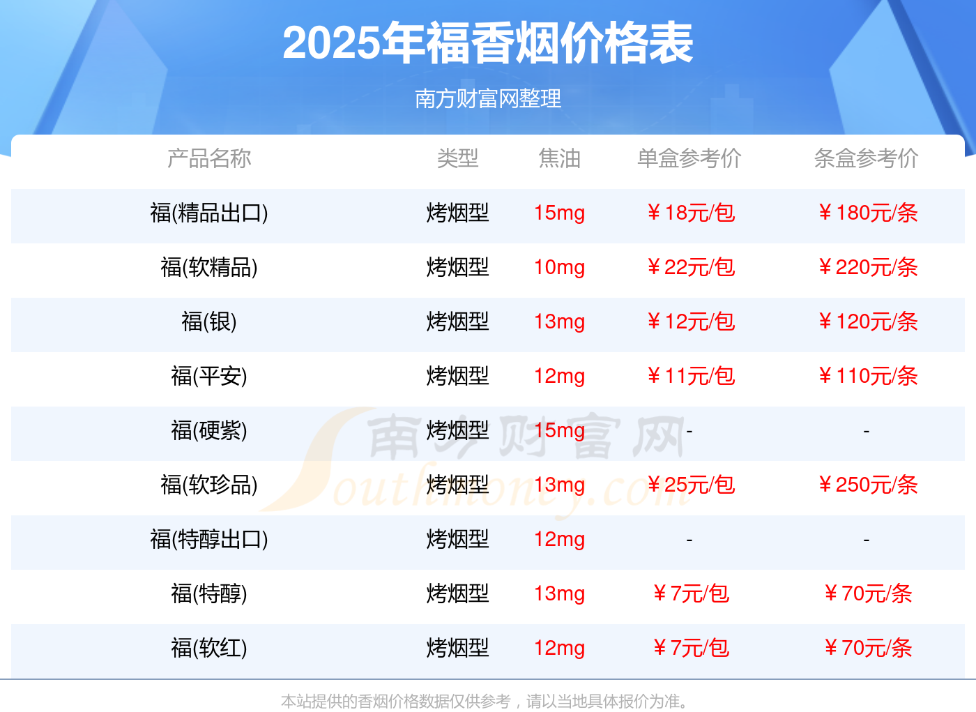 当下福价格最高的香烟为福(软珍品),参考价25.0元/包,而福香烟价格最低的是福(特醇),参考价7.0元/包,价格高低差为18元/包。