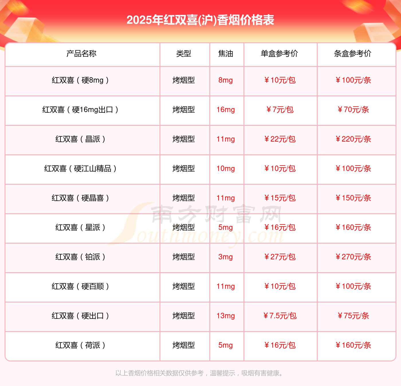 上海红双喜的前身为南洋烟草公司的红双喜,现拥有软盒红双喜、8mg硬盒红双喜、硬盒红双喜、红双喜硬盒百顺、红双喜硬盒精品、红双喜硬盒特供等多个品种。红双喜卷烟目前逐渐形成了15mg、11mg、8mg不同焦油量的系列。