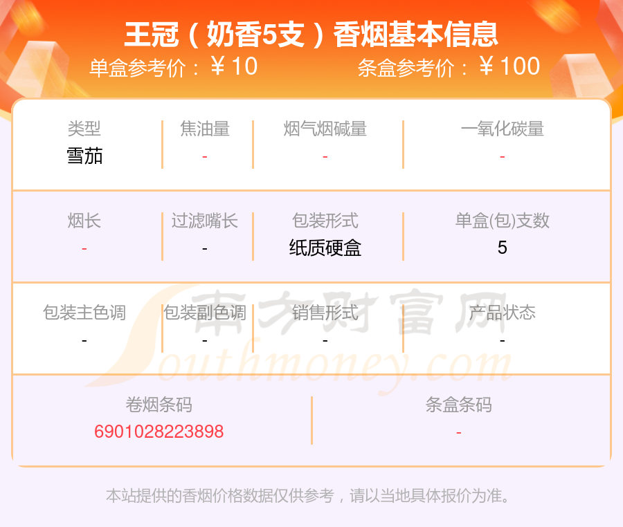王冠(奶香5支)香烟网友评分:口味4.5分,外观3.6分,性价比2.7分,综合得分3.6分。