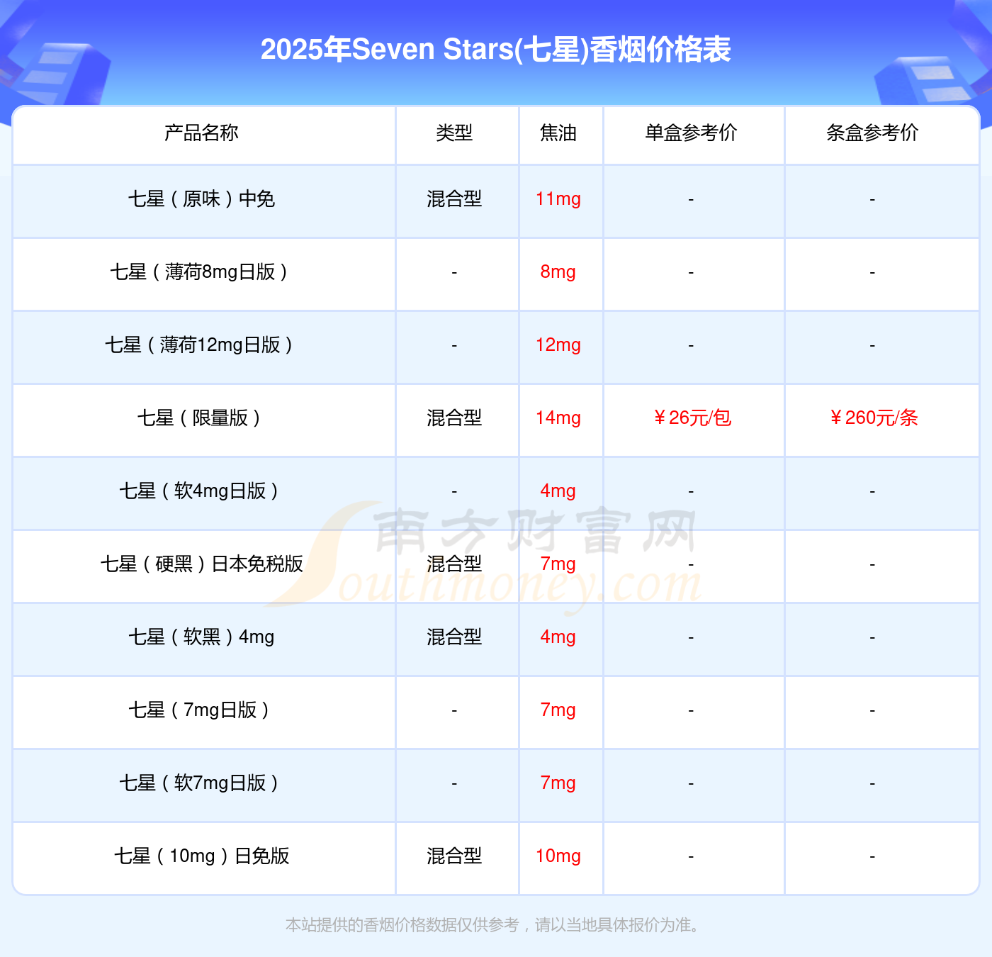 本站提供的香烟价格数据仅供参考,请以当地具体报价为准。