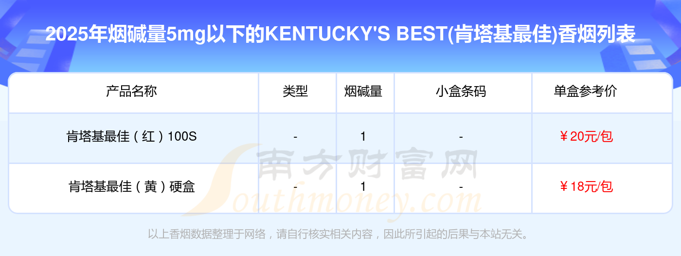 KENTUCKY'S BEST(肯塔基最佳)香烟烟碱量5mg以下的烟有肯塔基最佳(红)100S、肯塔基最佳(黄)硬盒等,详细价格如下:
