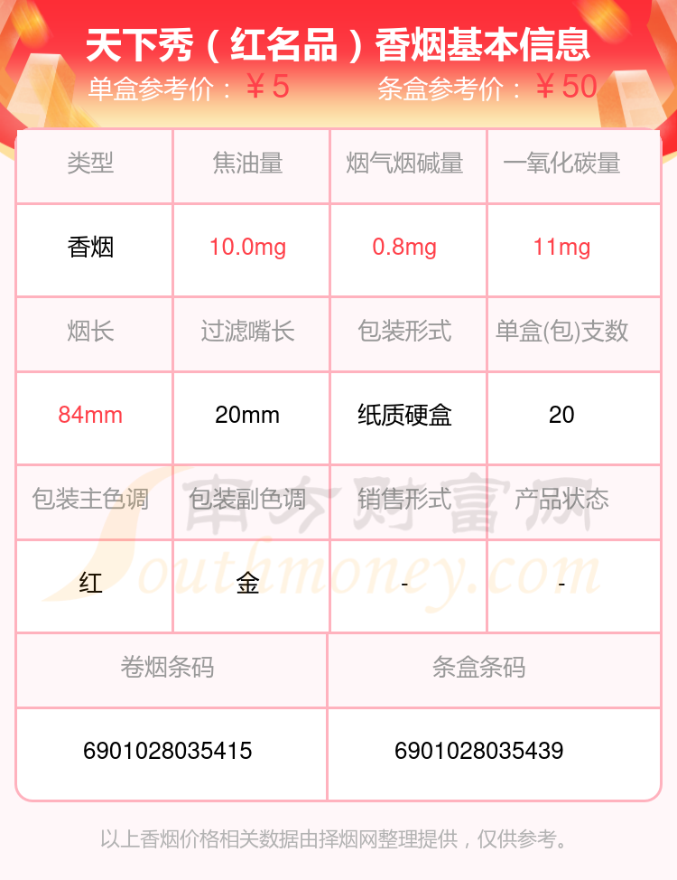 天下秀香烟焦油量低于10mg的烟有哪些?择烟网为大家整理提供,分别有:天下秀(红天地)、天下秀(金)、天下秀(红名品)、天下秀(佳品新版)等,具体价格如下: