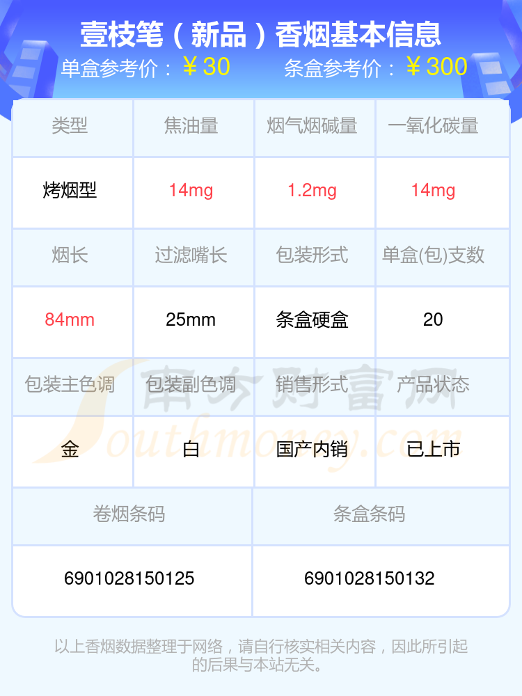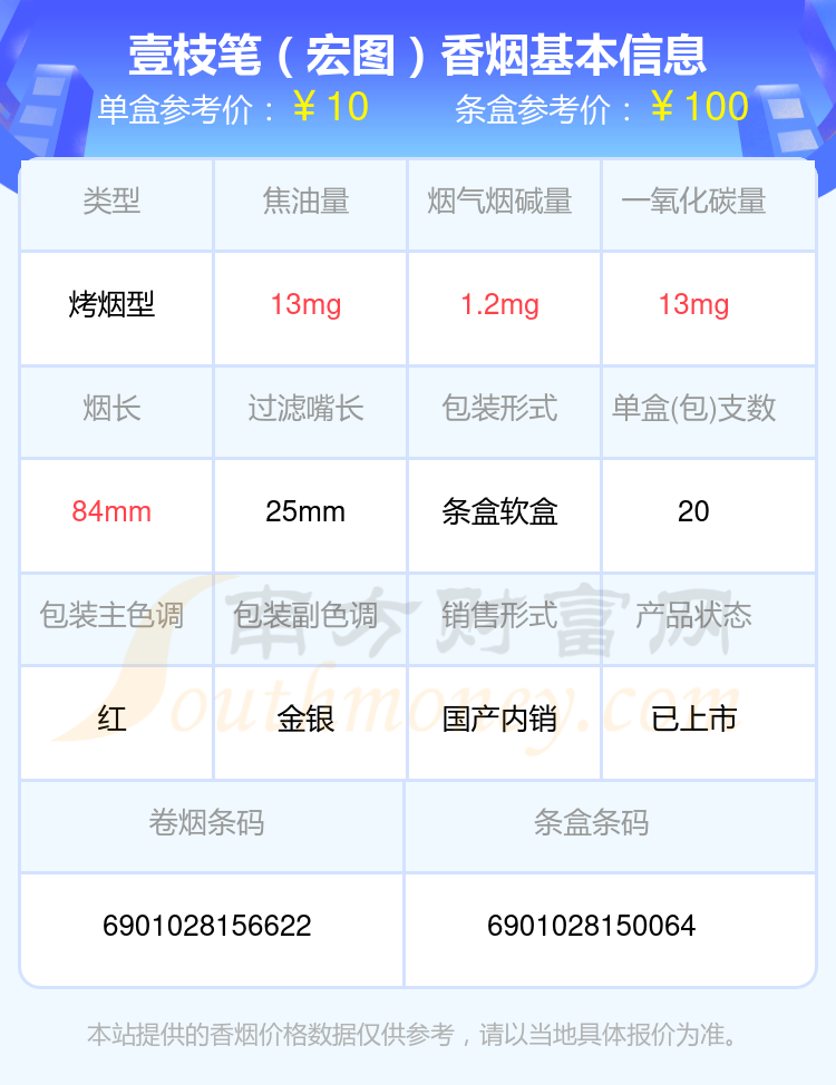 壹枝笔香烟烟碱量3mg以下的烟有壹枝笔(新贵)、壹枝笔(新品)、壹枝笔(珍贵)、壹枝笔(华贵2代)、壹枝笔(宏图)、壹枝笔(华贵)、壹枝笔(软红)等,具体价格如下: