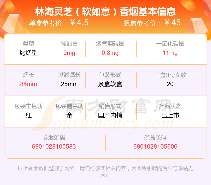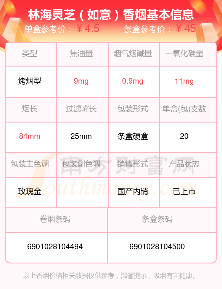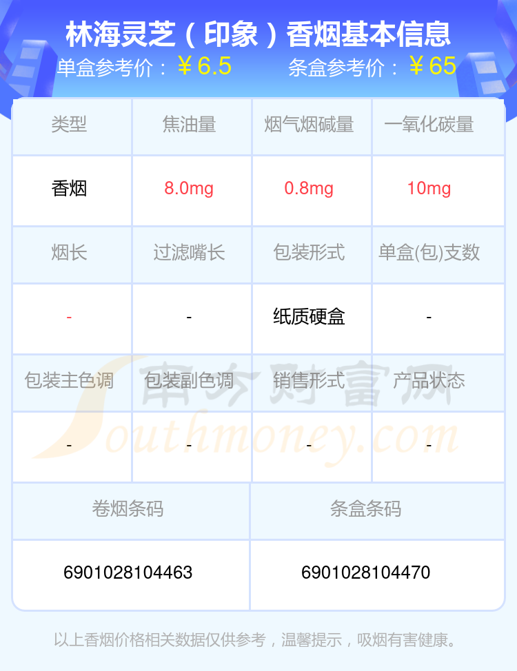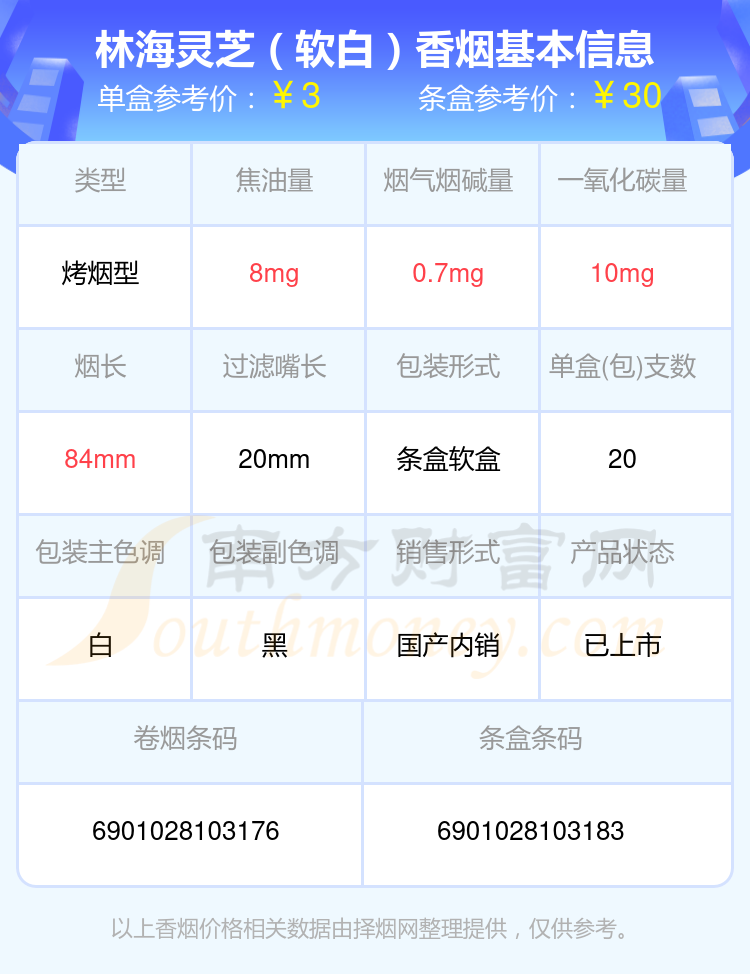 择烟网为大家盘点了焦油量10mg以下的林海灵芝香烟,分别有林海灵芝(如意)、林海灵芝(软如意)、林海灵芝(印象)、林海灵芝(蓝色经典)、林海灵芝(祥瑞8mg)、林海灵芝(软白)、林海灵芝(硬白)等,具体价格如下:
