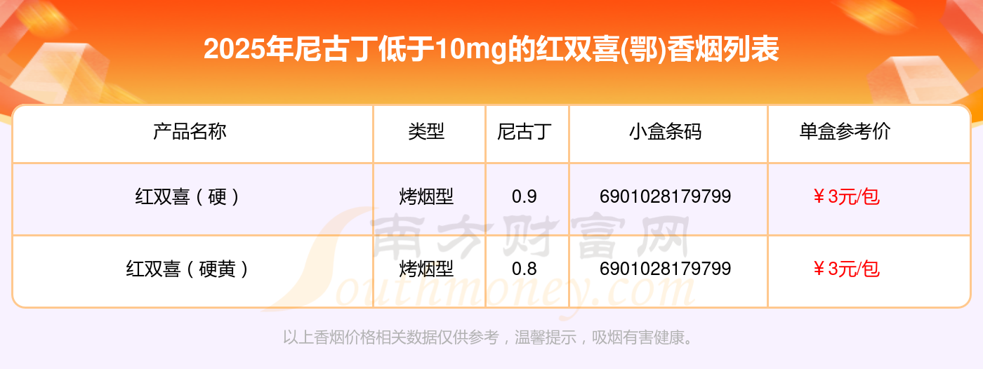 红双喜(鄂)香烟尼古丁低于10mg的烟2025都有哪些?