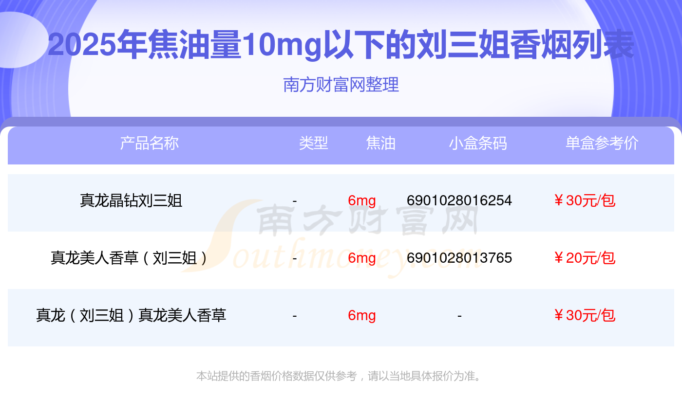 刘三姐香烟焦油量10mg以下的烟分别有真龙晶钻刘三姐参考价30元/包、真龙美人香草(刘三姐)参考价20元/包、真龙(刘三姐)真龙美人香草参考价30元/包等。