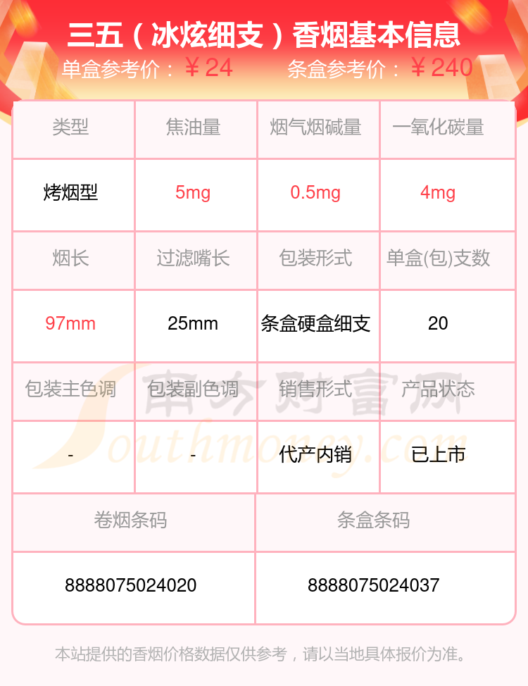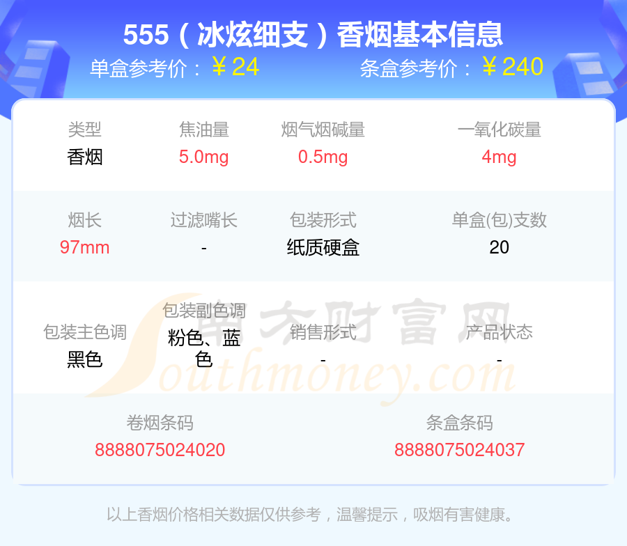 择烟网为大家盘点了烟碱低于0.5mg的555(三五)香烟,分别有555(冰炫细支)、三五(冰炫细支)等,具体价格如下: