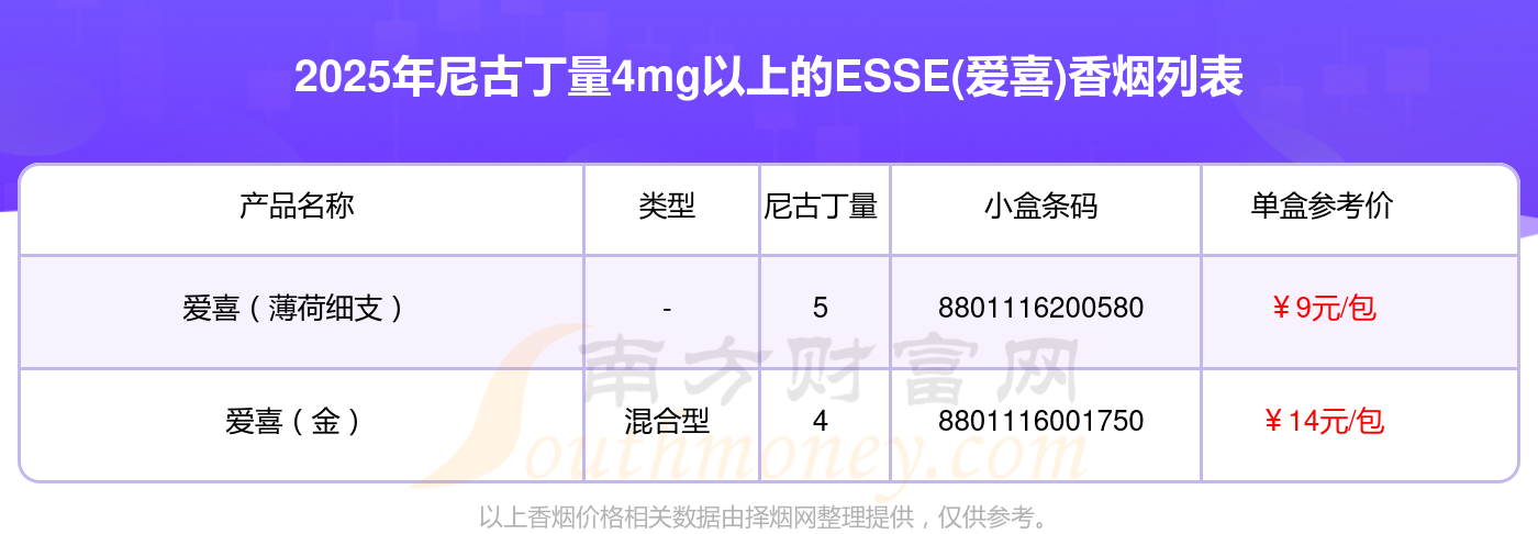爱喜(薄荷细支)参考价9元/包、爱喜(金)参考价14元/包等。