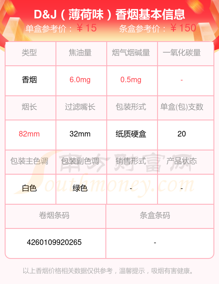 择烟网为大家盘点了D&J香烟尼古丁低于0.5mg的,分别有D&J(薄荷味)、D&J(金版)等,详细价格如下: