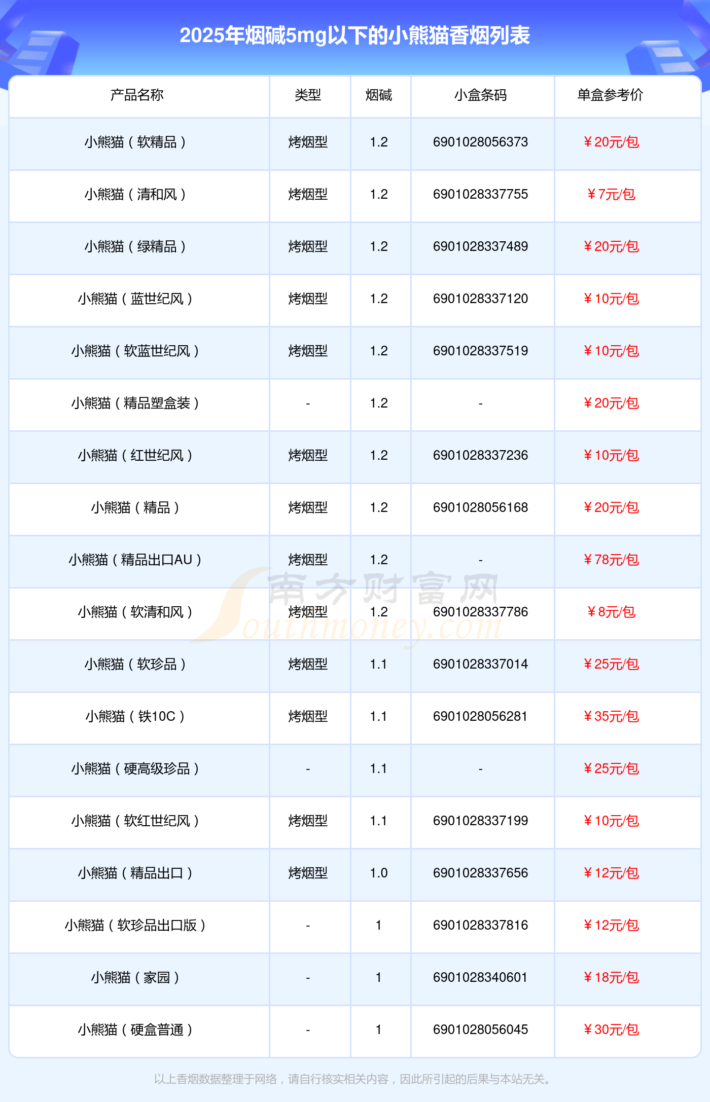择烟网为大家盘点了烟碱5mg以下的小熊猫香烟,有小熊猫(软精品)、小熊猫(清和风)、小熊猫(绿精品)、小熊猫(蓝世纪风)、小熊猫(软蓝世纪风)、小熊猫(精品塑盒装)、小熊猫(红世纪风)、小熊猫(精品)、小熊猫(精品出口AU)、小熊猫(软清和风)等,详细价格如下: