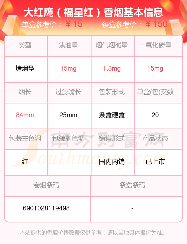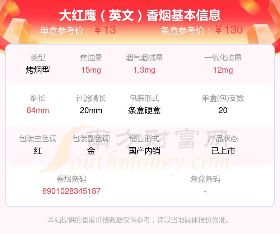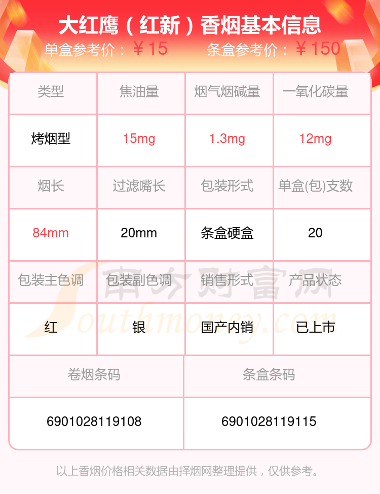大红鹰(英文)参考价13元/包、大红鹰(红新)参考价15元/包、大红鹰(福星红)参考价15元/包等。