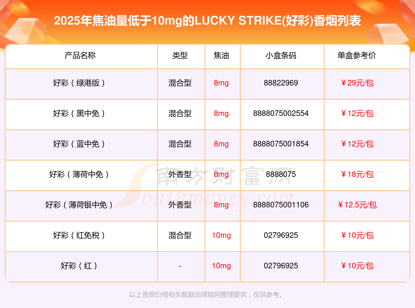 择烟网为大家盘点了LUCKY STRIKE(好彩)香烟焦油量低于10mg的,分别有好彩(绿港版)、好彩(黑中免)、好彩(蓝中免)、好彩(薄荷中免)、好彩(薄荷银中免)、好彩(红免税)、好彩(红)等,具体价格如下: