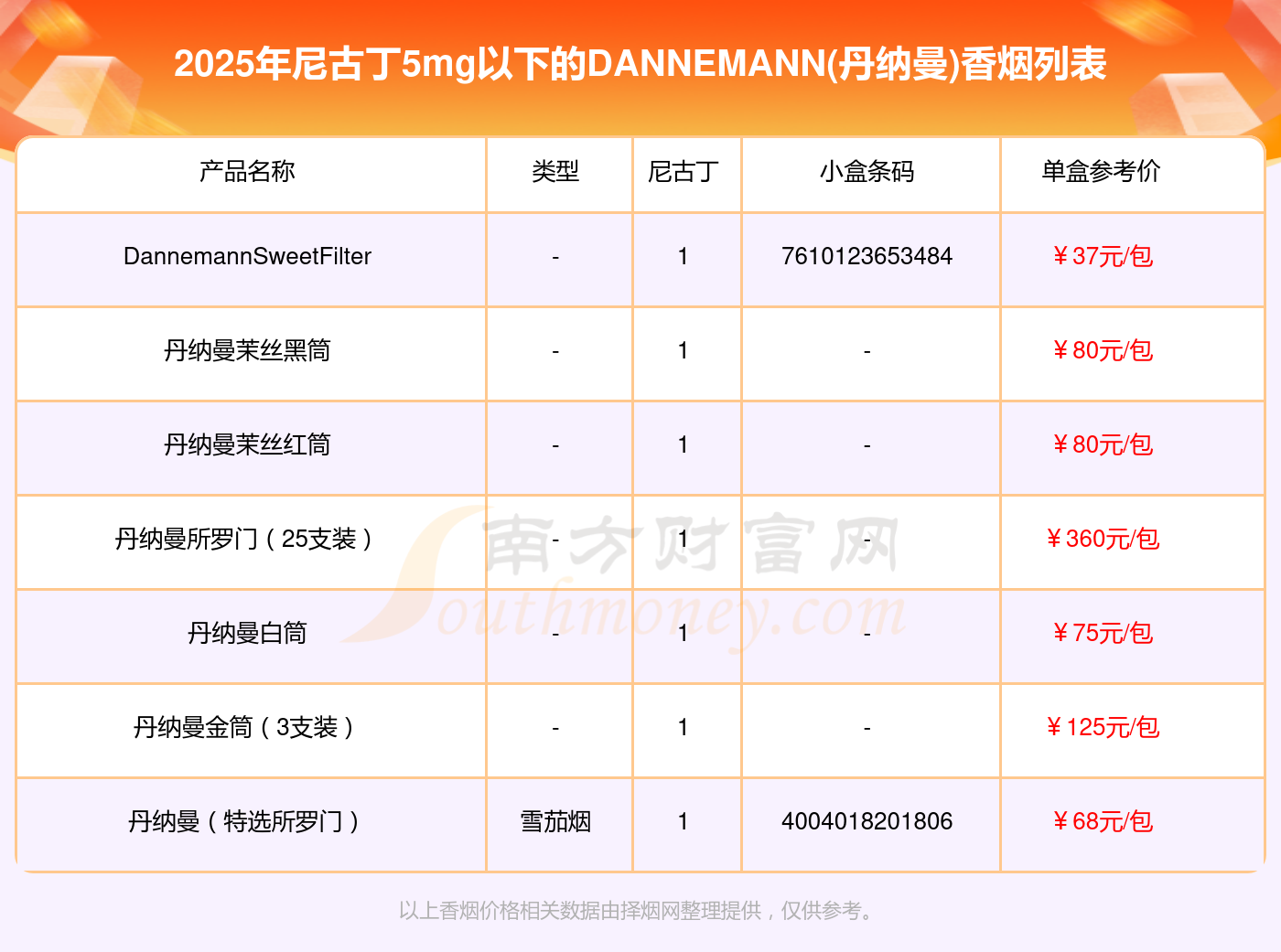 择烟网为大家盘点了DANNEMANN(丹纳曼)香烟尼古丁5mg以下的,分别有DannemannSweetFilter、丹纳曼茉丝黑筒、丹纳曼茉丝红筒、丹纳曼所罗门(25支装)、丹纳曼白筒、丹纳曼金筒(3支装)、丹纳曼(特选所罗门)等,具体价格如下: