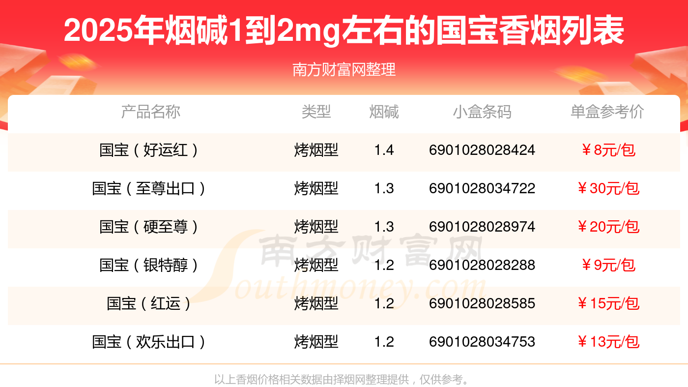 国宝香烟烟碱1到2mg左右的烟有国宝(好运红)、国宝(至尊出口)、国宝(硬至尊)、国宝(银特醇)、国宝(红运)、国宝(欢乐出口)等,详细价格如下: