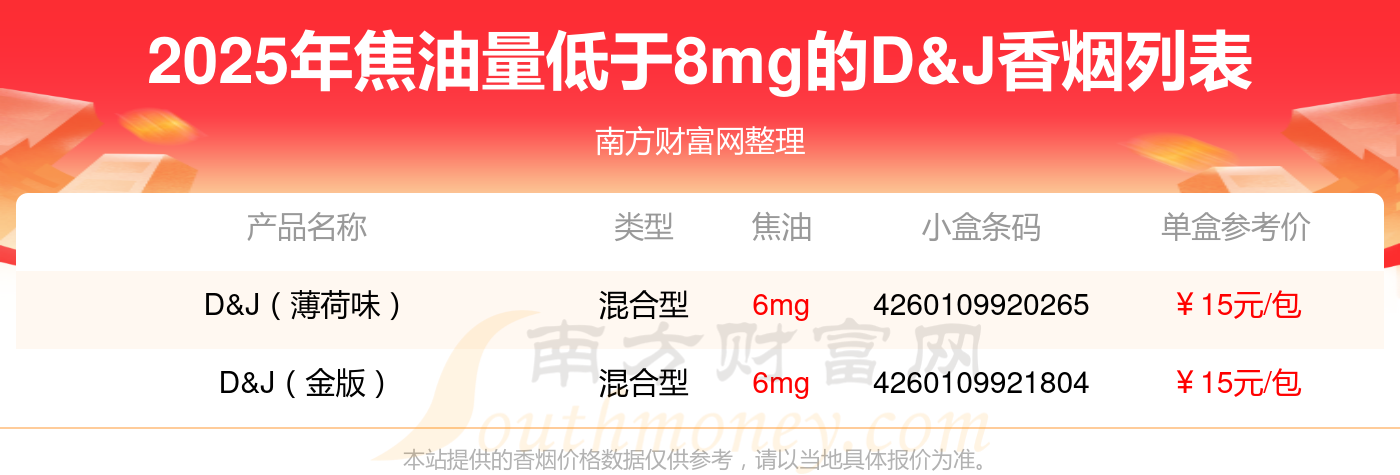 择烟网为大家盘点了焦油量低于8mg的D&J香烟,有以下这些: