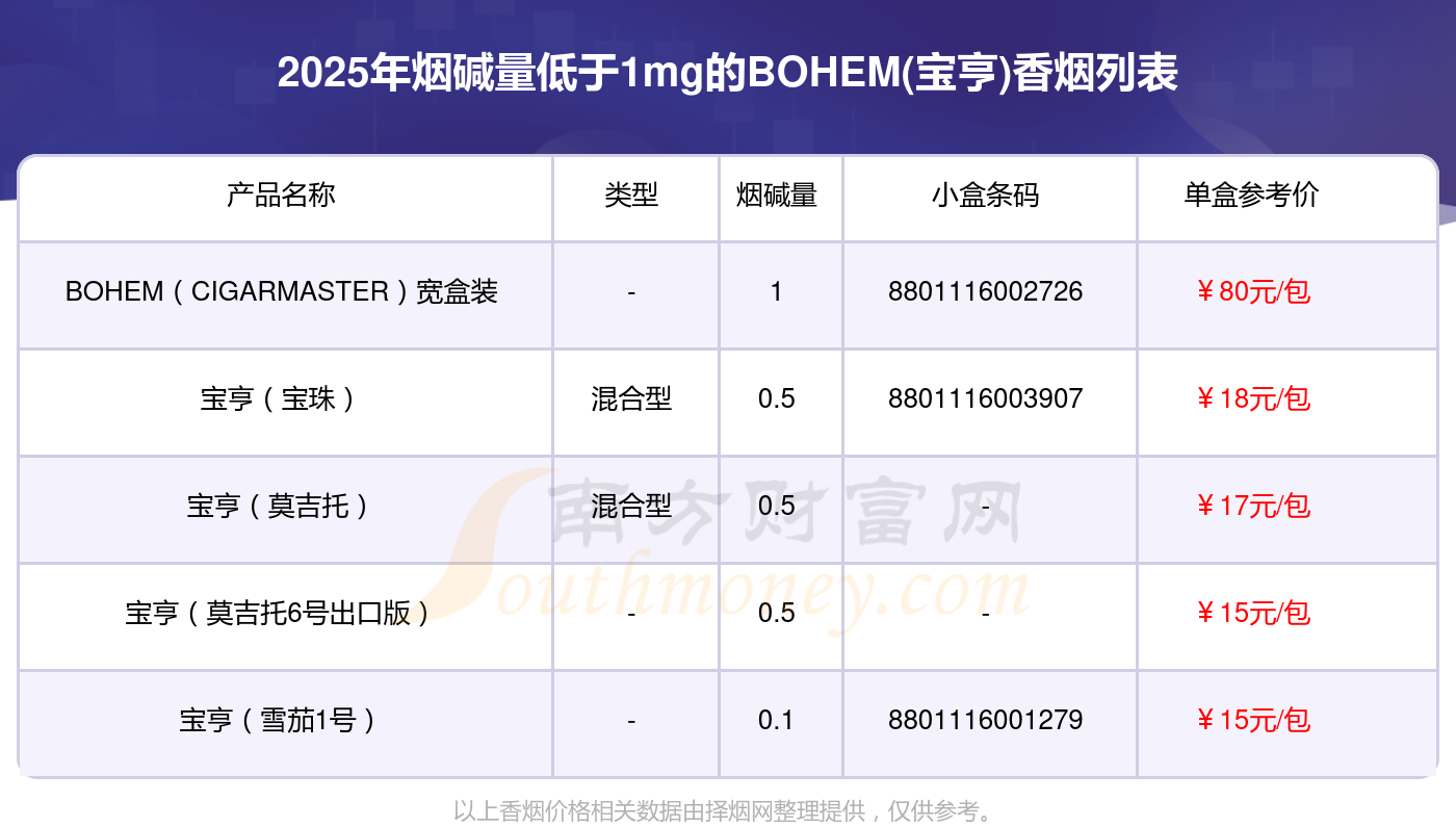 烟碱量低于1mg的BOHEM(宝亨)香烟有哪些?择烟网为大家整理盘点,分别有:BOHEM(CIGARMASTER)宽盒装、宝亨(宝珠)、宝亨(莫吉托)、宝亨(莫吉托6号出口版)、宝亨(雪茄1号)等,具体价格如下: