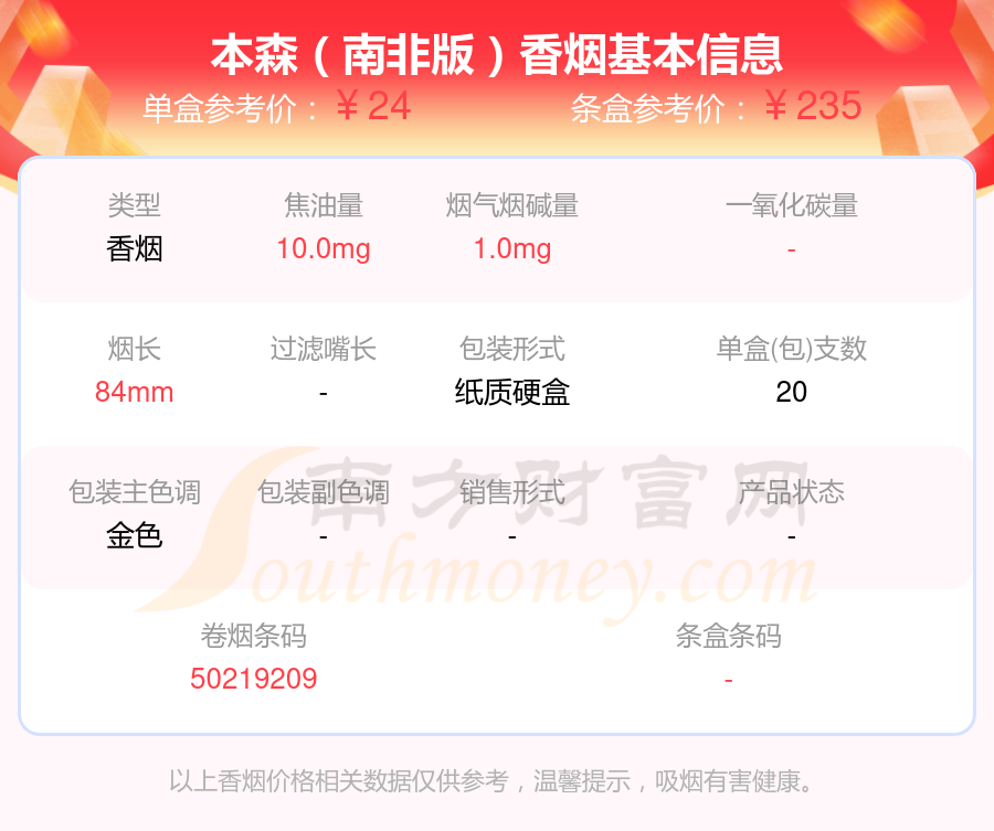 本森(南非版)参考价24.0元/包、本森(迪拜gcc)参考价28.0元/包等。
