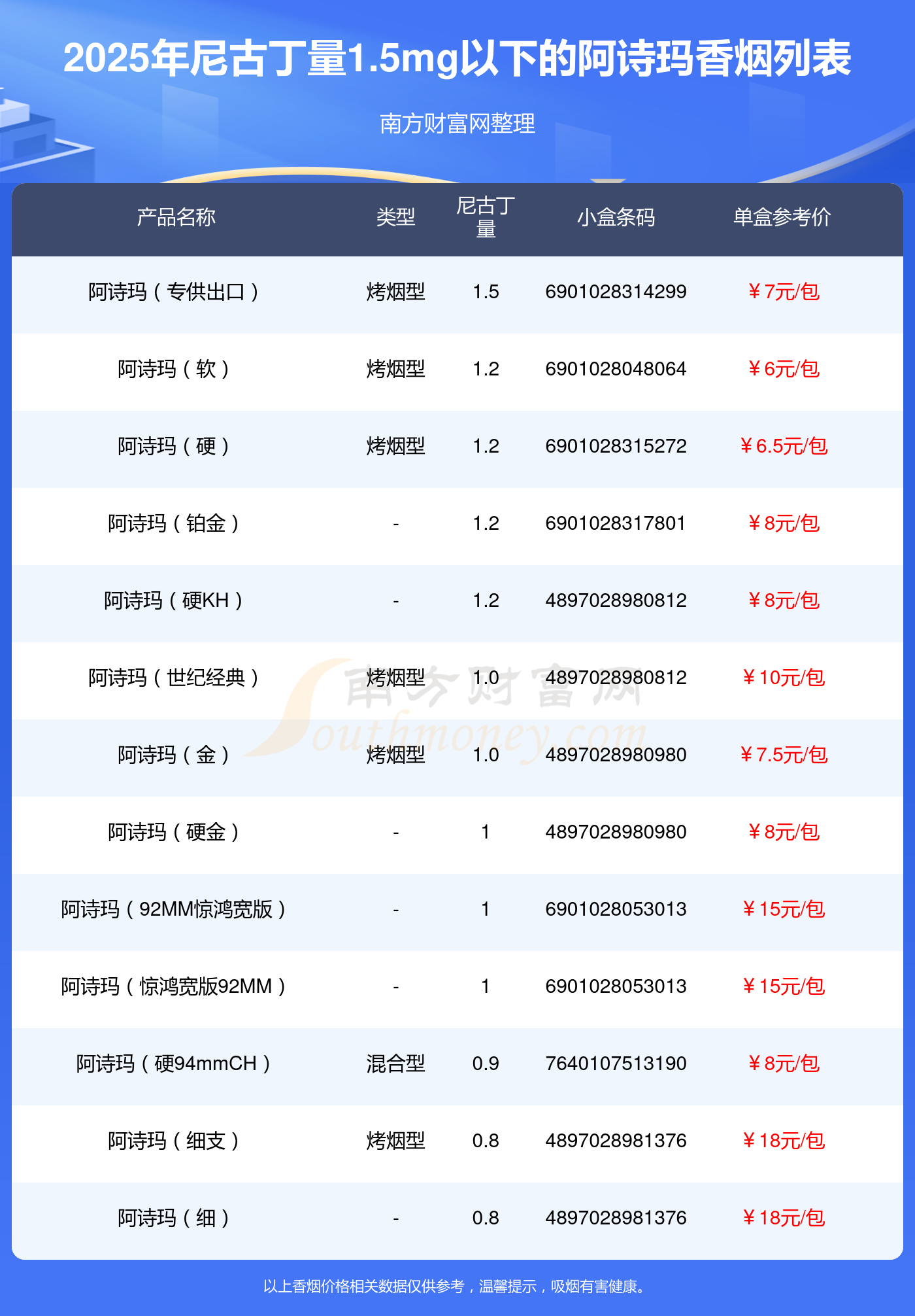 择烟网为大家盘点了尼古丁量1.5mg以下的阿诗玛香烟,分别有阿诗玛(专供出口)、阿诗玛(软)、阿诗玛(硬)、阿诗玛(铂金)、阿诗玛(硬KH)、阿诗玛(世纪经典)、阿诗玛(金)、阿诗玛(硬金)、阿诗玛(92MM惊鸿宽版)、阿诗玛(惊鸿宽版92MM)等,具体价格如下: