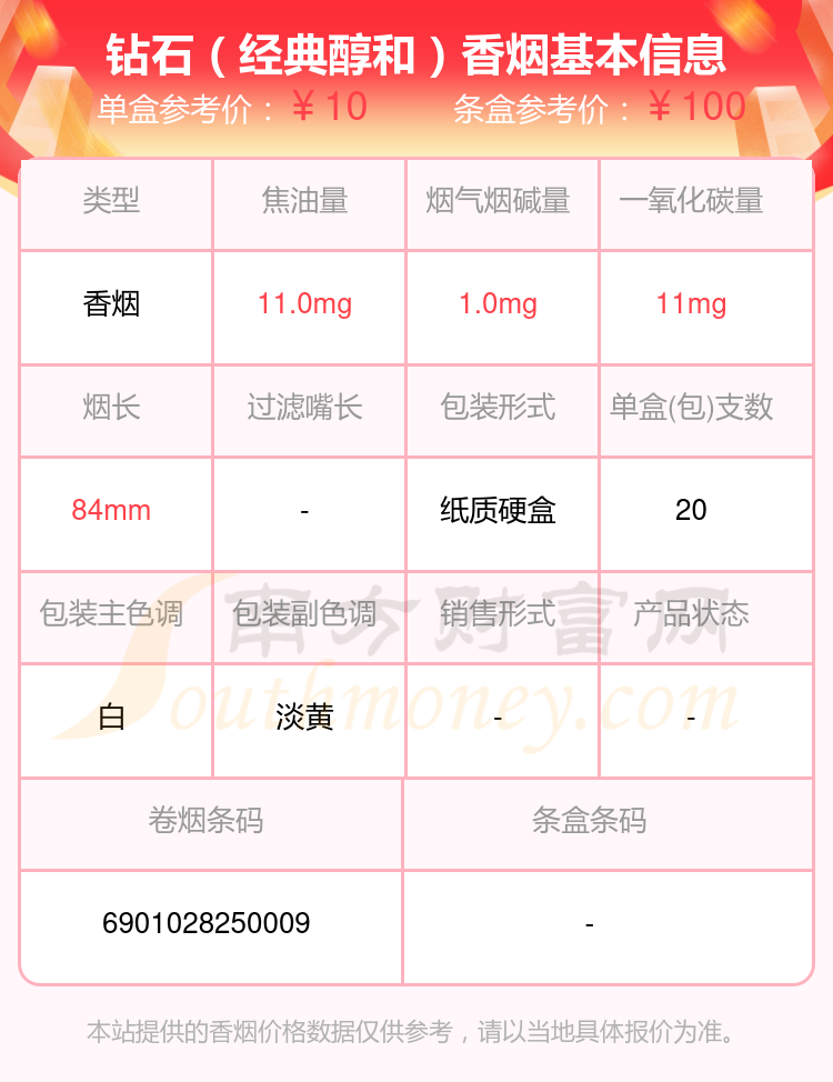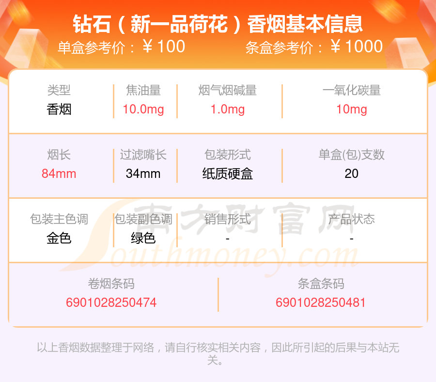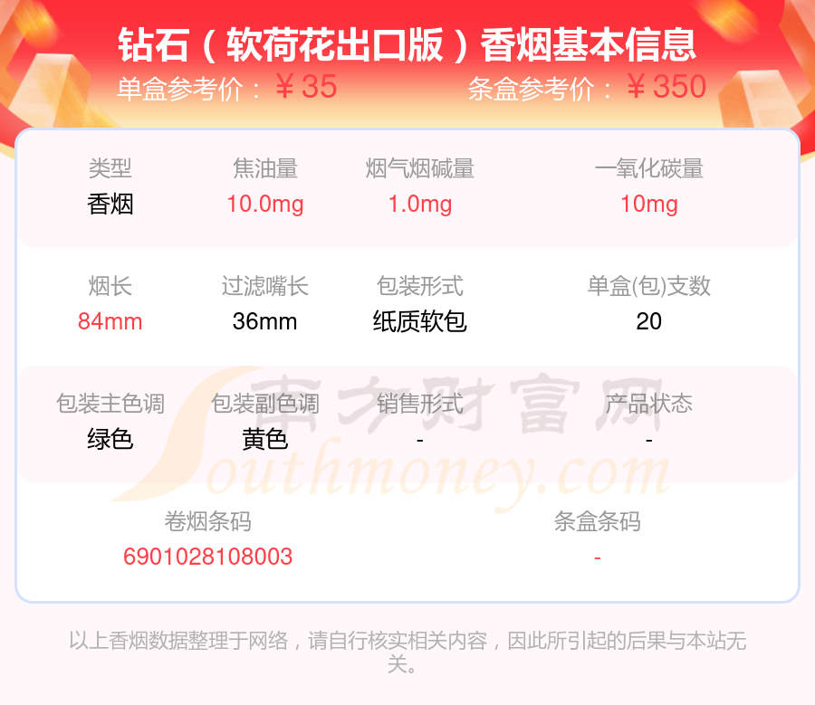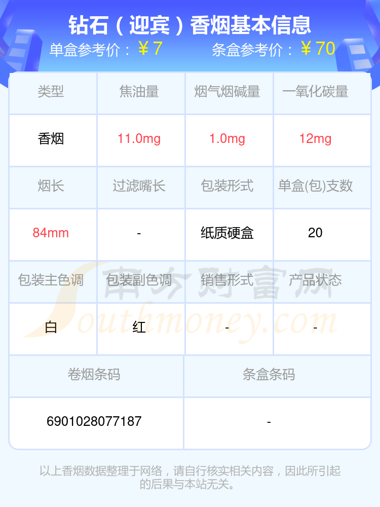 择烟网为大家盘点了烟碱1mg以下的钻石香烟,有钻石(迎宾)、钻石(经典醇和)、钻石(新一品荷花)、钻石(玫瑰2代)、钻石(传奇子龙)、钻石(软荷花出口版)、钻石(西柏坡1949)、钻石(红如意)、钻石(硬红)、钻石(软绿)等,详细价格如下: