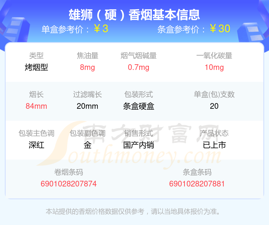 雄狮(红老版)参考价5元/包、雄狮(红)参考价2元/包、雄狮(双叶.薄荷)参考价3元/包、雄狮(硬)参考价3元/包、雄狮(薄荷)参考价3元/包等。