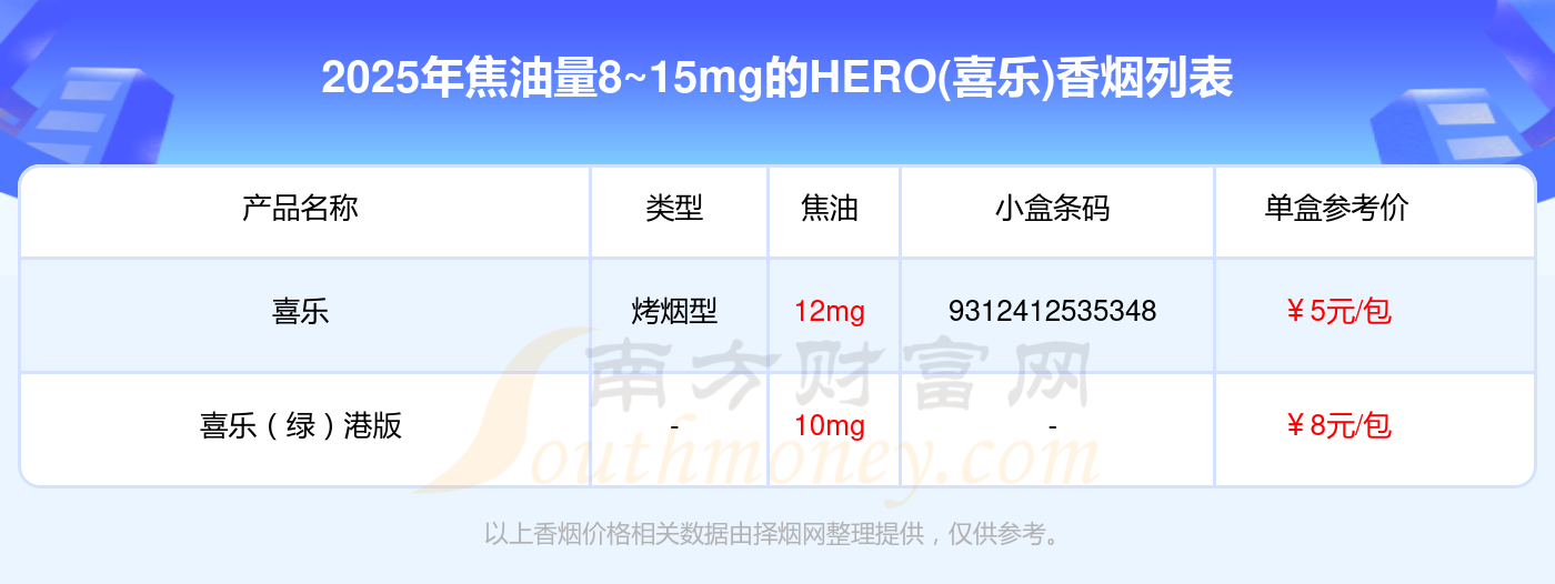 HERO(喜乐)香烟焦油量8~15mg的烟2025查询一览